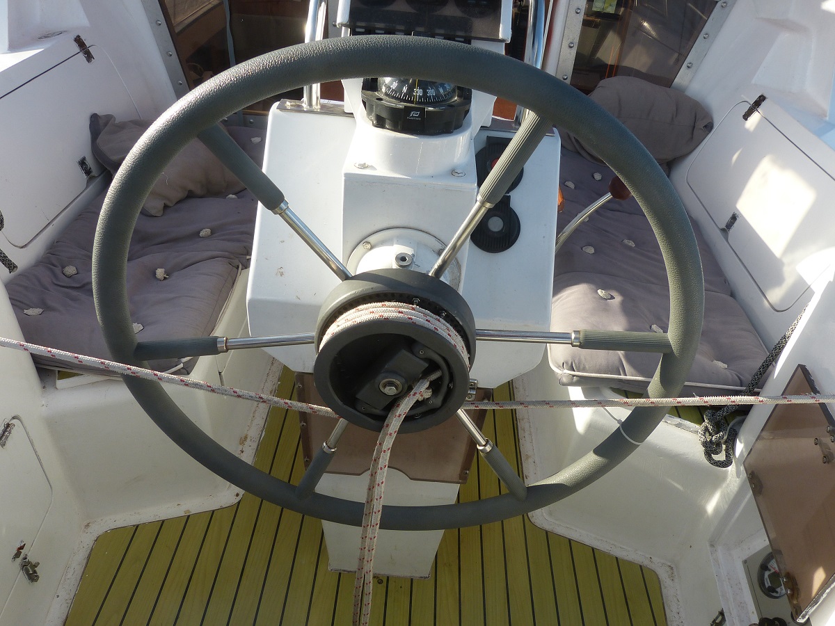 Außerdem fehlten uns die für die Befestigung notwendigen U-Haken. Die Anbringung am Steuerrad ist aber unsere letzte Hoffnung. Haben uns also auf die Suche nach U-Haken gemacht und tatsächlich Anfang der Woche passende gefunden. Erster Test auf dem Weg von Arrecife nach Lobos misslang. Die Taue hatte ich verkehrt herum aufgewickelt. Wollte Emma nach rechts, steuerte Luna Mare nach links.