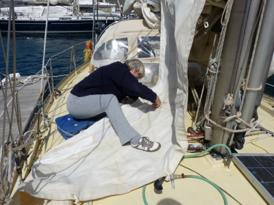 Bereits erledigt war auch die Segelreparatur, die Skipperin hatte mit einer kleinen, aber genialen „Segelhandnähmaschine“ den großen Riss und noch gleich ein paar kleinere, die sie während der Reparatur entdeckete, genäht.