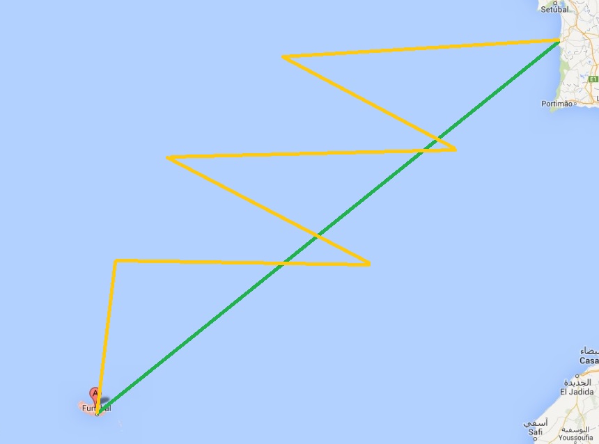 Morgen geht es los, wir wollen von Madeira nach Sines/Portugal segeln (grüne Linie), aber was heißt wollen? Bei dem dort vorherrschenden Wind wird es wohl eher die orange Linie . Schaun mer mal.