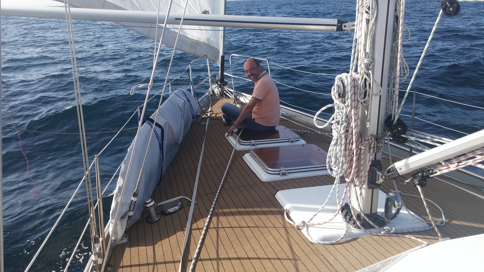 Wind von hinten bedeutet allerdings, dass die normale Segelstellung nicht funktioniert, da das Vorsegel durch das Großsegel vom Wind abgedeckt wird und es entsprechend zu Schlagen anfängt. Und die Gefahr einer Patenthalse (Baum wandert vehement von einer Seite auf die andere und bringt damit Risiken für die Besatzung und das Schiff) zu vermeiden haben wir den Baum mit einem sogenannten Bullenstander festgezurrt. Und das Vorsegel mit einem sogenannten Spi-Baum stabilisiert.