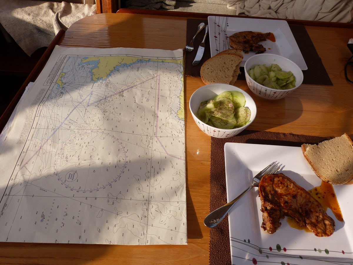 Unruhiges Wetter führt zu Schwierigkeiten, warmes Essen zu zu bereiten und auch etwas Appetitlosigkeit. Am ersten Tag deshalb nur kalt, am zweiten zumindest eine warme Suppe und das hier am 3. Tag, an dem sich Hunger einstellte und die See ruhiger war.
