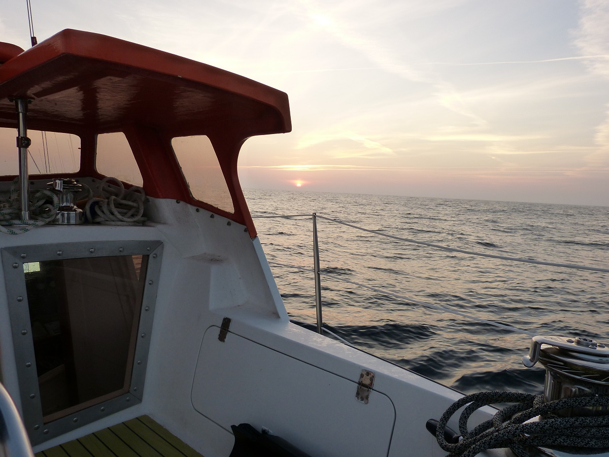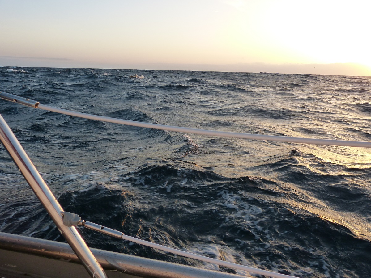 Es ist noch bewölkt, aber für den nächsten Tage ist Sonne vorhergesagt. Eine sternenklare Nacht verheißt gutes. Aber direkt nach Sonnenaufgang hat sich eine Art Hochnebel gebildet, der bis zum Abend bleibt und uns einen grauen und kühlen Tag beschert. Erst kurz vor ihrem Untergang zeigt sich die Sonne dann doch noch kurz mal. So schaukeln wir weiter durch die relativ hohen und, da kurz und steil, unangenehmen Wellen. Die Höhe soll sich aber im Laufe der Überfahrt von den jetzt immer noch 3m auf unter 1m reduzieren und sie sollen länger, und damit angenehmer werden.