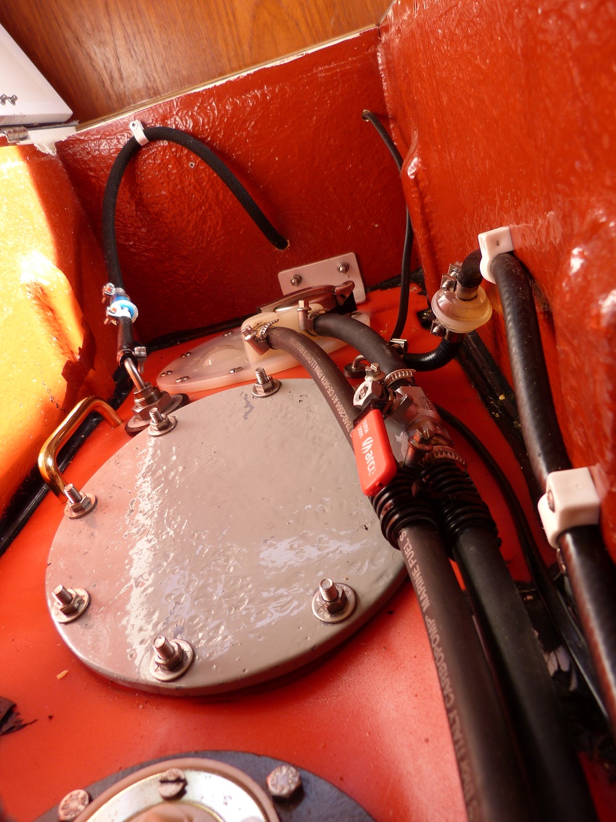 1. Der Tank hat sich auf Grund des warmen Rücklaufdiesels am Anschlussbereich noch oben gewölbt. Das muss wohl bereits im Juni passiert sein, da wir Anfang Juli in Wladislawowo zum ersten Mal das Problem hatten (damals hatten wir uns in die Marina schleppen lassen). Dann war mehrere Monate Ruhe, bis es seit Cherbourg immer häufiger auftrat. Das Material des Tanks ist wohl zu dünn.