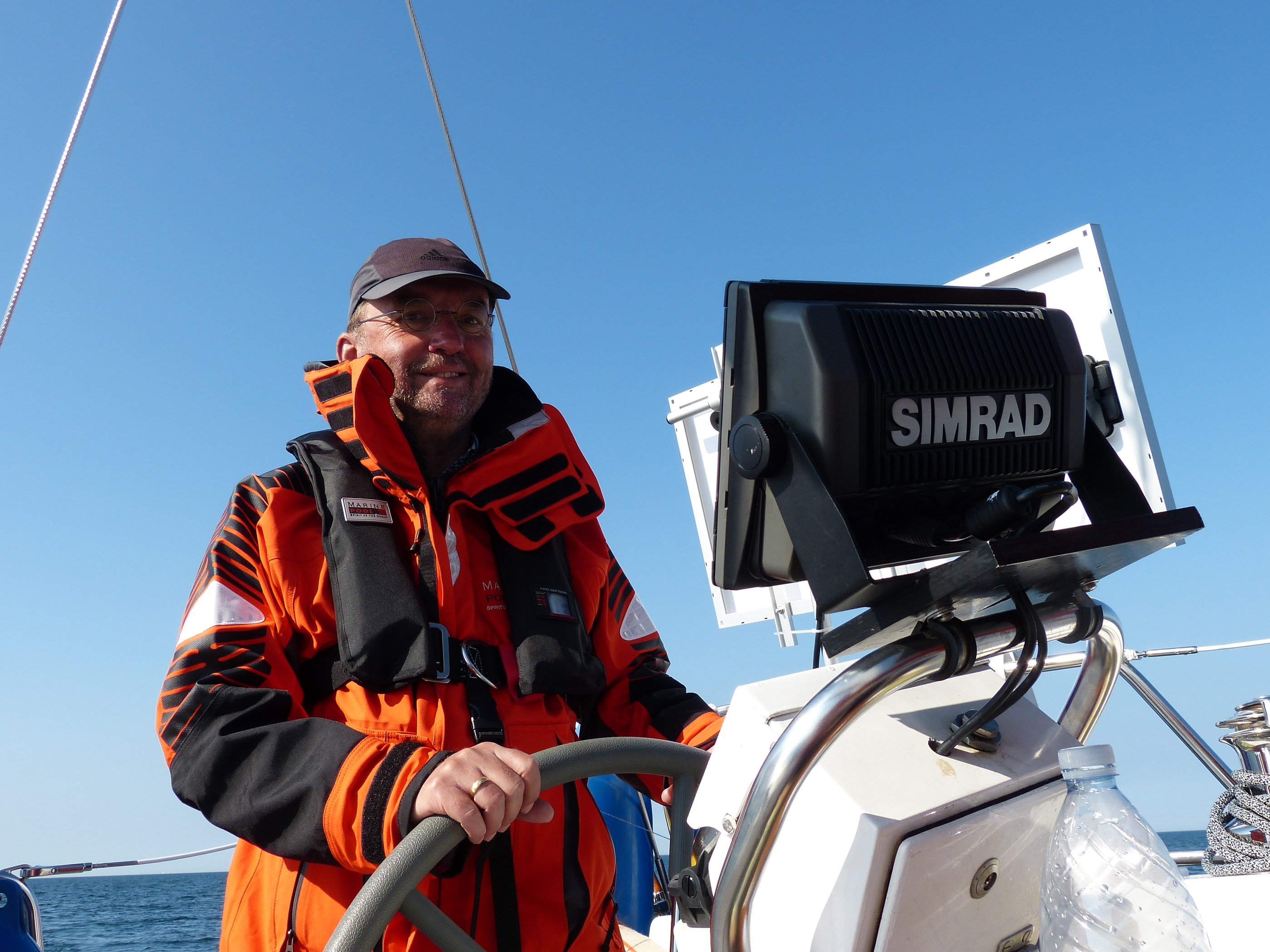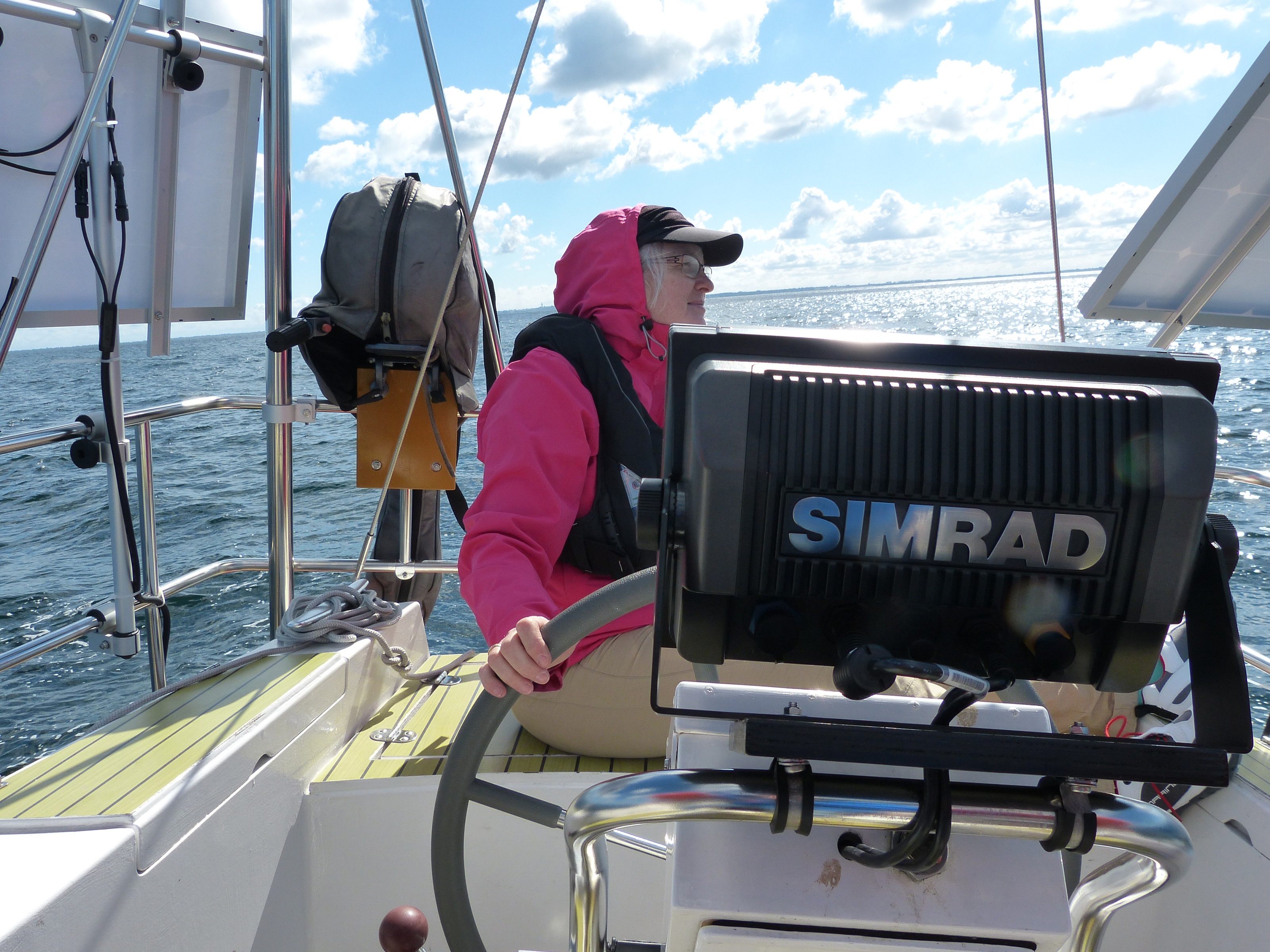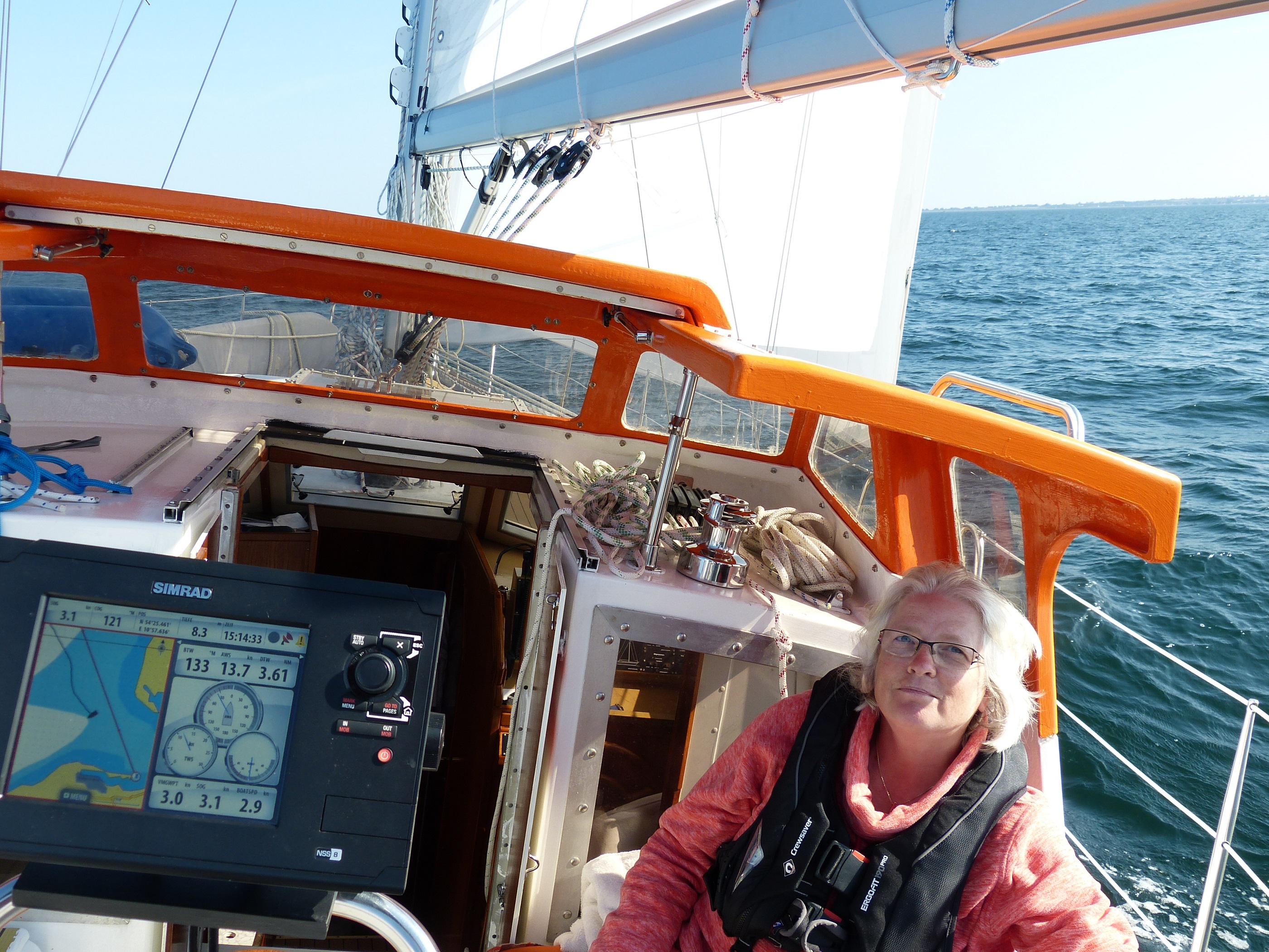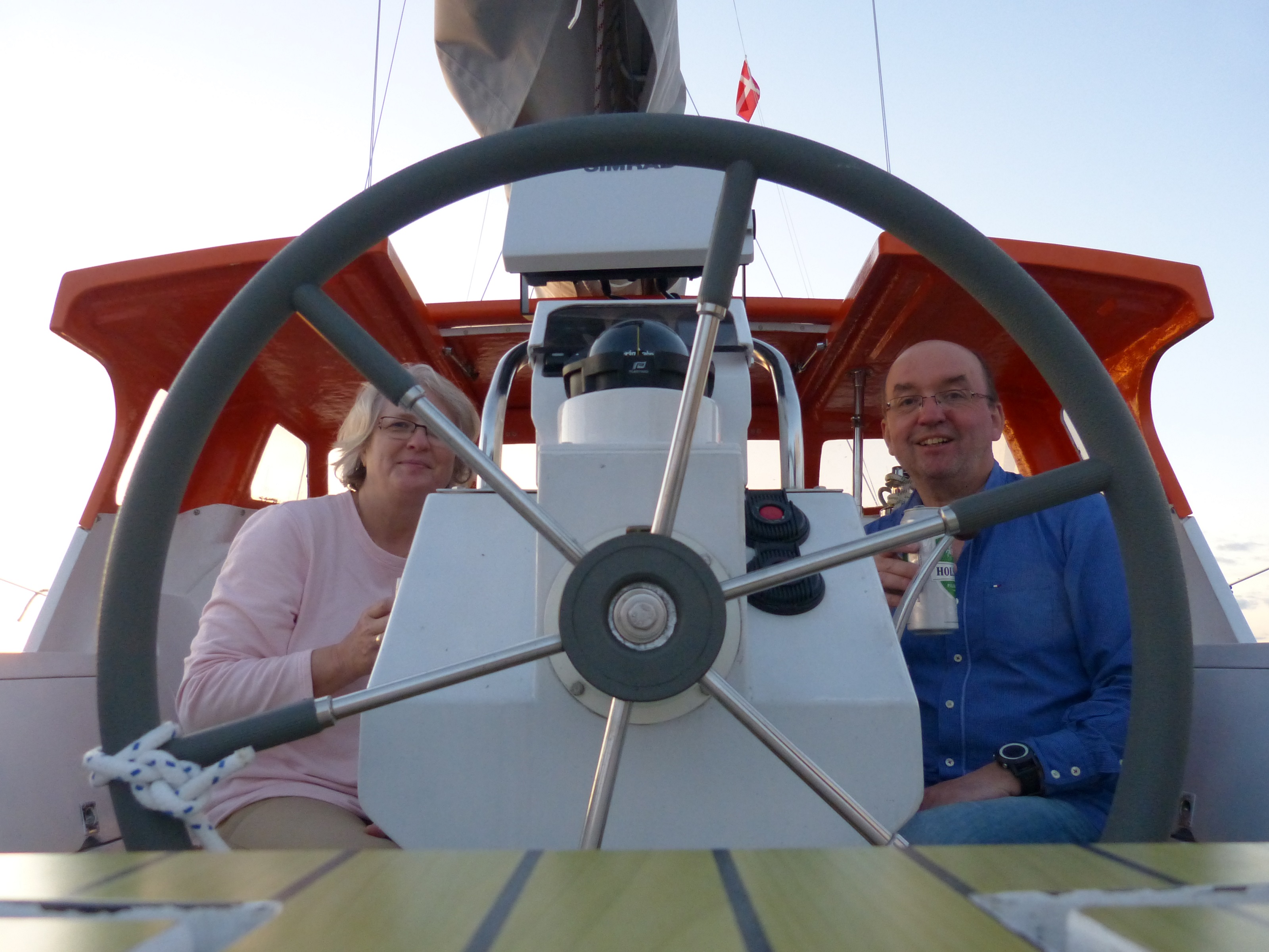 Innensteuerstand: Da absolute Flaute herrschte, waren wir unter Motor unterwegs. Es war sonnig, aber kühl. So habe wir das Boot das erste Mal vom Innensteuerstand aus bedient. Schon toll, durch die reichlich Fenster ist das bei Sonnenschein eine Art Wintergarten.