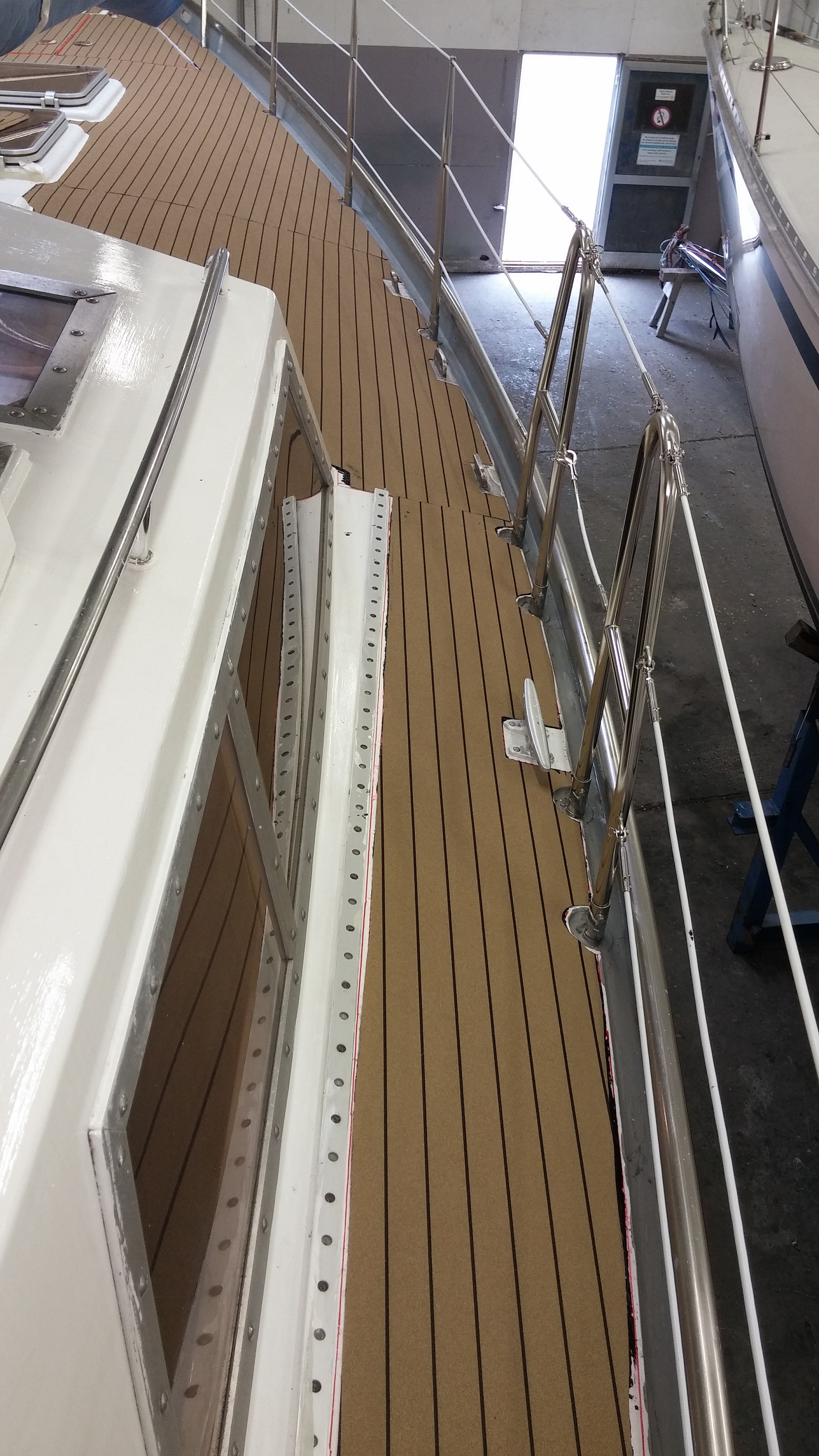 Als Alternative haben wir einen PVC-Decksbelag gefunden. Laut Angebot kostet das Ganze inkl. Kleber für das gesamte Deck rund € 1.100. Die oben beschriebene Reparatur machen zu lassen würde ungefähr das dreifach kosten. Der Decksbelag ist zwar meiner Erachtens optisch nicht optimal, aber darum geht es ja auch nur zweitrangig. Zweckmäßig muss es sein und das halten wir für gegeben. Die Verlegung ist aber zeitaufwändig und so haben wir noch gut zu tun, bis es ins Wasser geht.