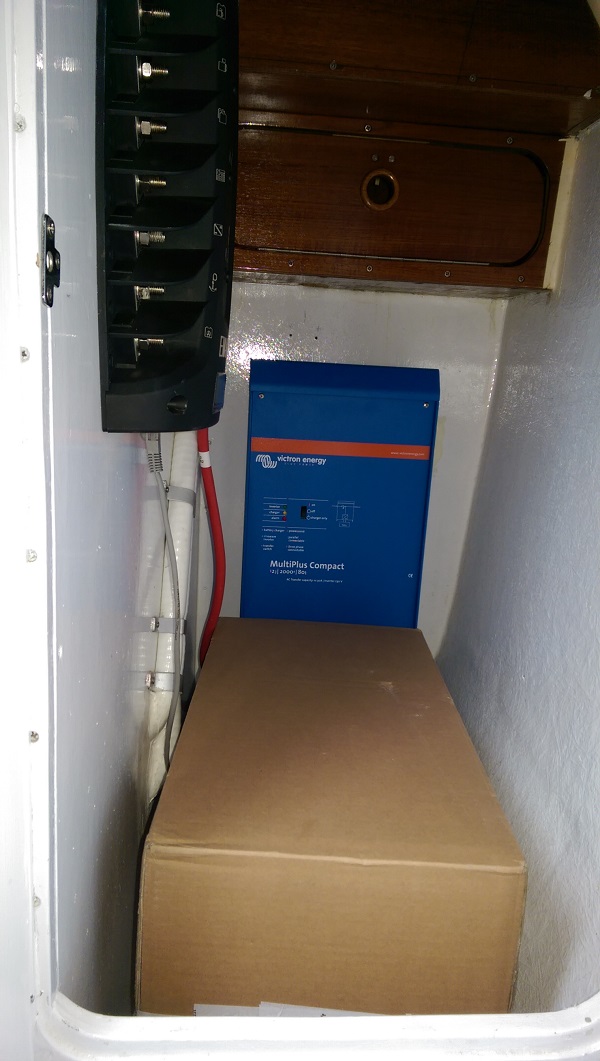 Hierbei sind das Ladegerät und die EM-Box echt, die Batterie ist eine Attrape. Hier soll in eben dieser Größe möglichst eine Lithium-Ionen Batterie seinen Platz finden. Die sind ja mittlerweile preislich schon fast vertretbar, sofern man die theoretische Leistung beachtet (AGM * x, aber auch Leistung * x). Als Starterbatterie und für die Ankerwinde wollen wir AGM Batterien mit je rund 100 Ah verwenden. Die Lithium-Ionen Batterie sollte so um die 500 Ah haben. Hier hoffen wir, dass sich in den nächsten 12 Monaten noch was hinsichtlich Kapazität und Preisen zu unseren Gunsten tut.