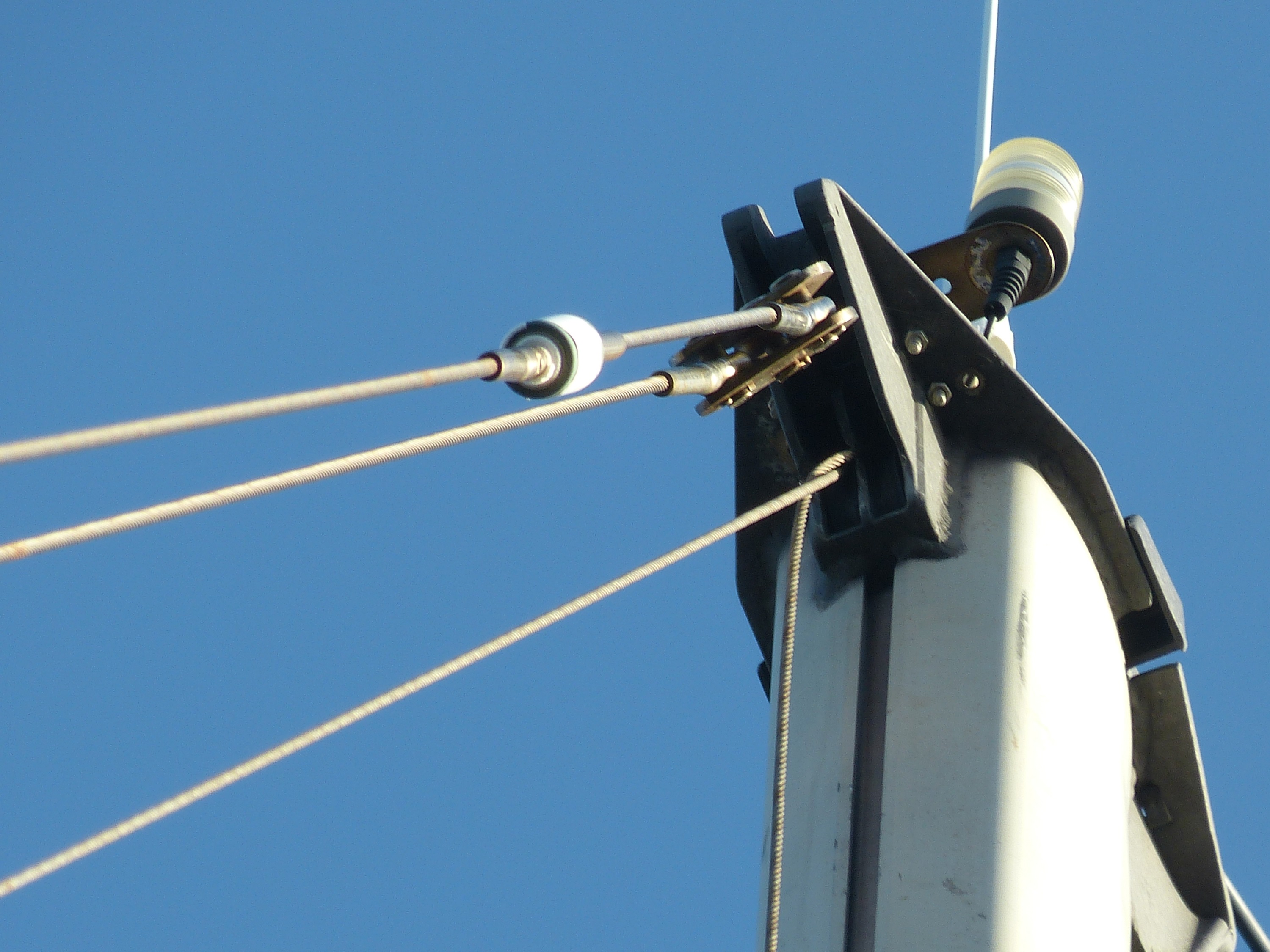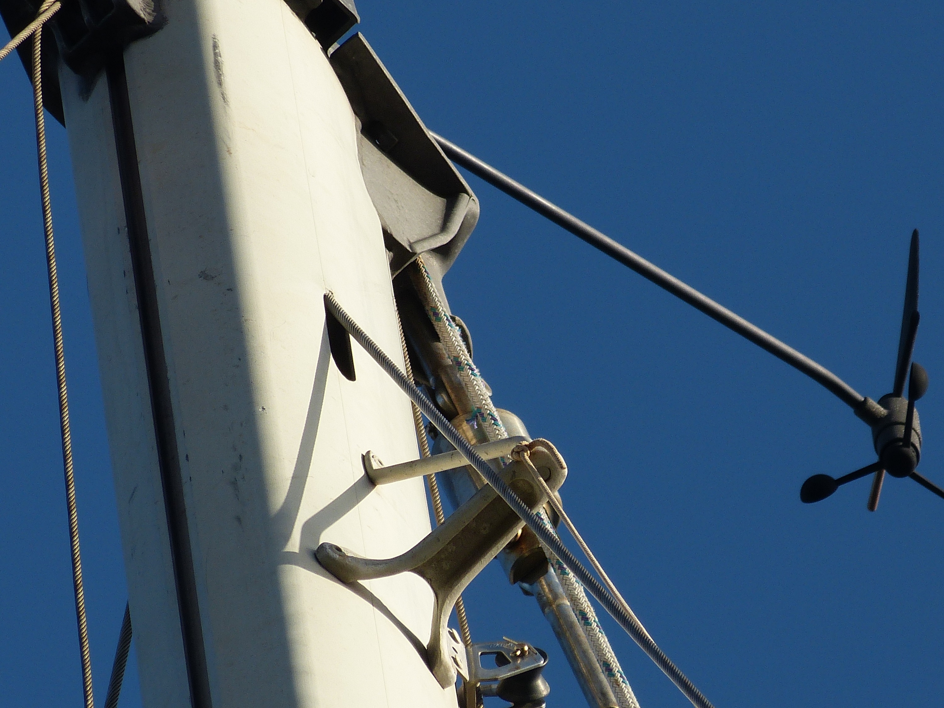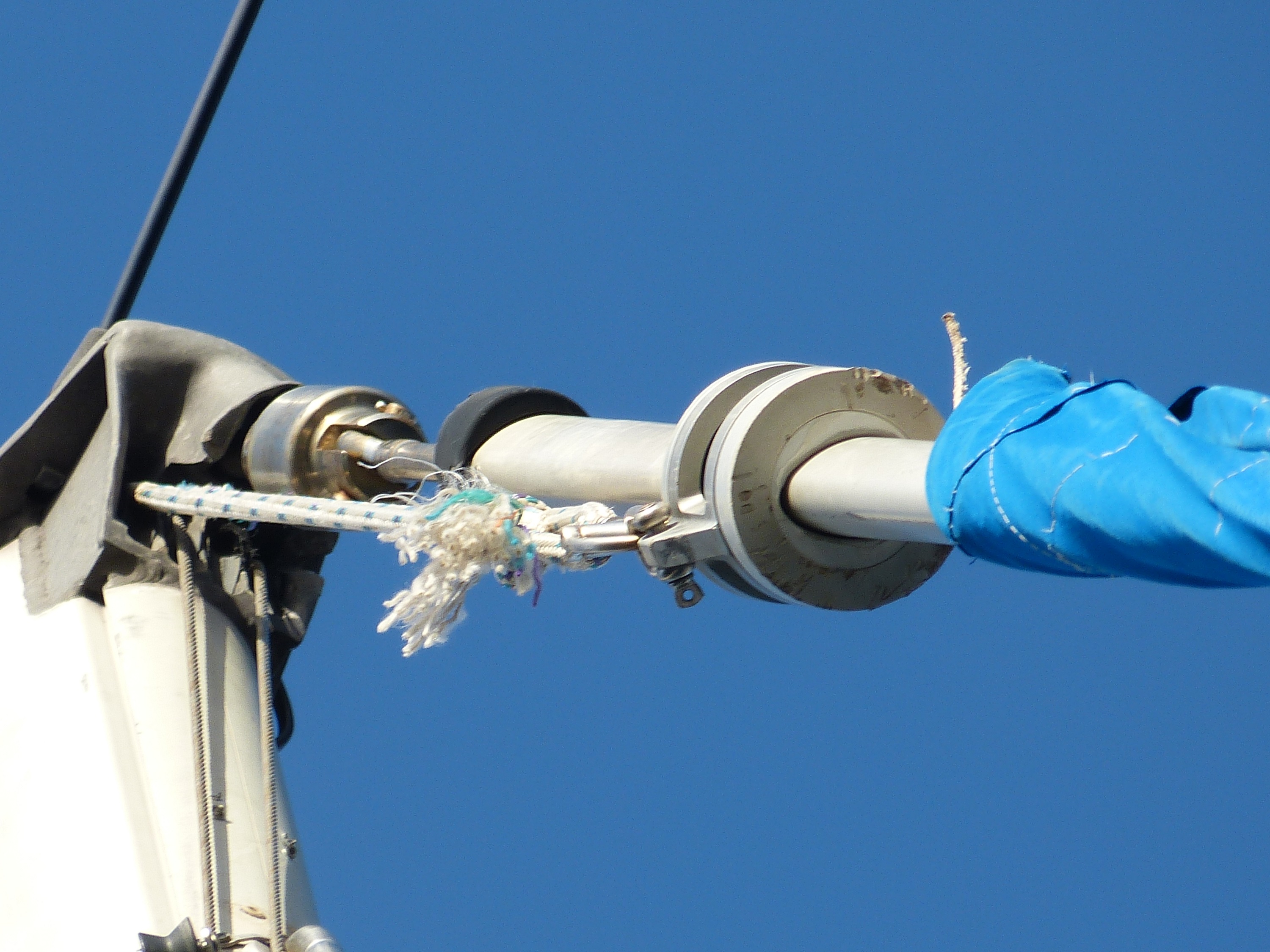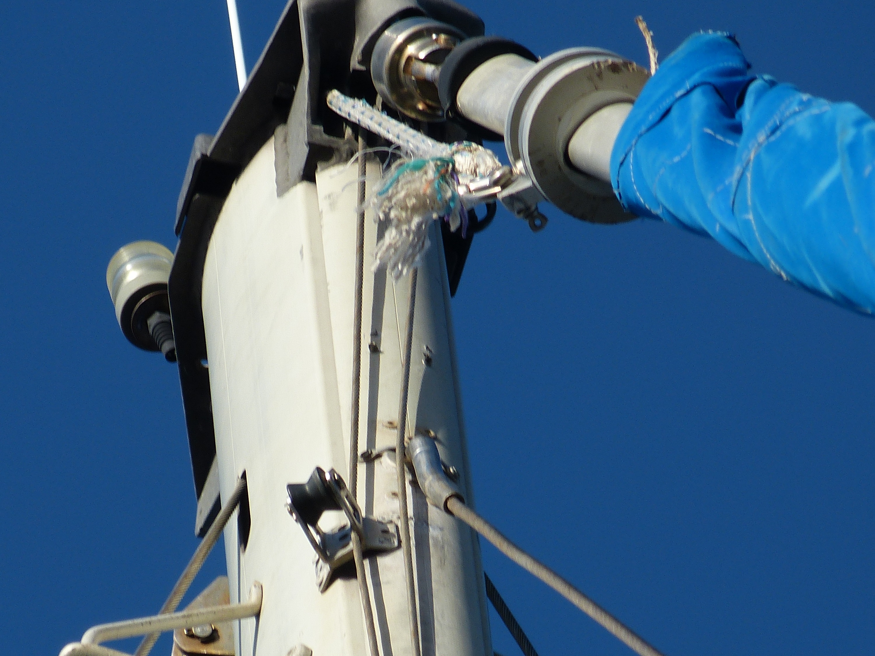 Daran sind wir gescheitert. Wir haben es nicht geschafft, die Genua einzuholen. Da die Schiene, in dem das Vorsegel geführt wird, aus nunmehr drei Teilen besteht, lässt sich die Genua nicht einfach runter nehmen. Das Abmachen des Vorstags geht auch nicht ohne weiteres, da die Verstellschrauben, die eine Verlängerung und Herausnahme der Spannung ermöglichen würden, so abgedeckt sind, dass ich nicht durch einfache Bordmittel drankomme. Insgesamt schien mir das Ganze zu aufwändig und wenig sinnvoll im Vergleich zu Plan B: Zweites (vorhandenes) Vorstag dran und mit halt etwas kleiner Fock die nächste Etappe angehen.