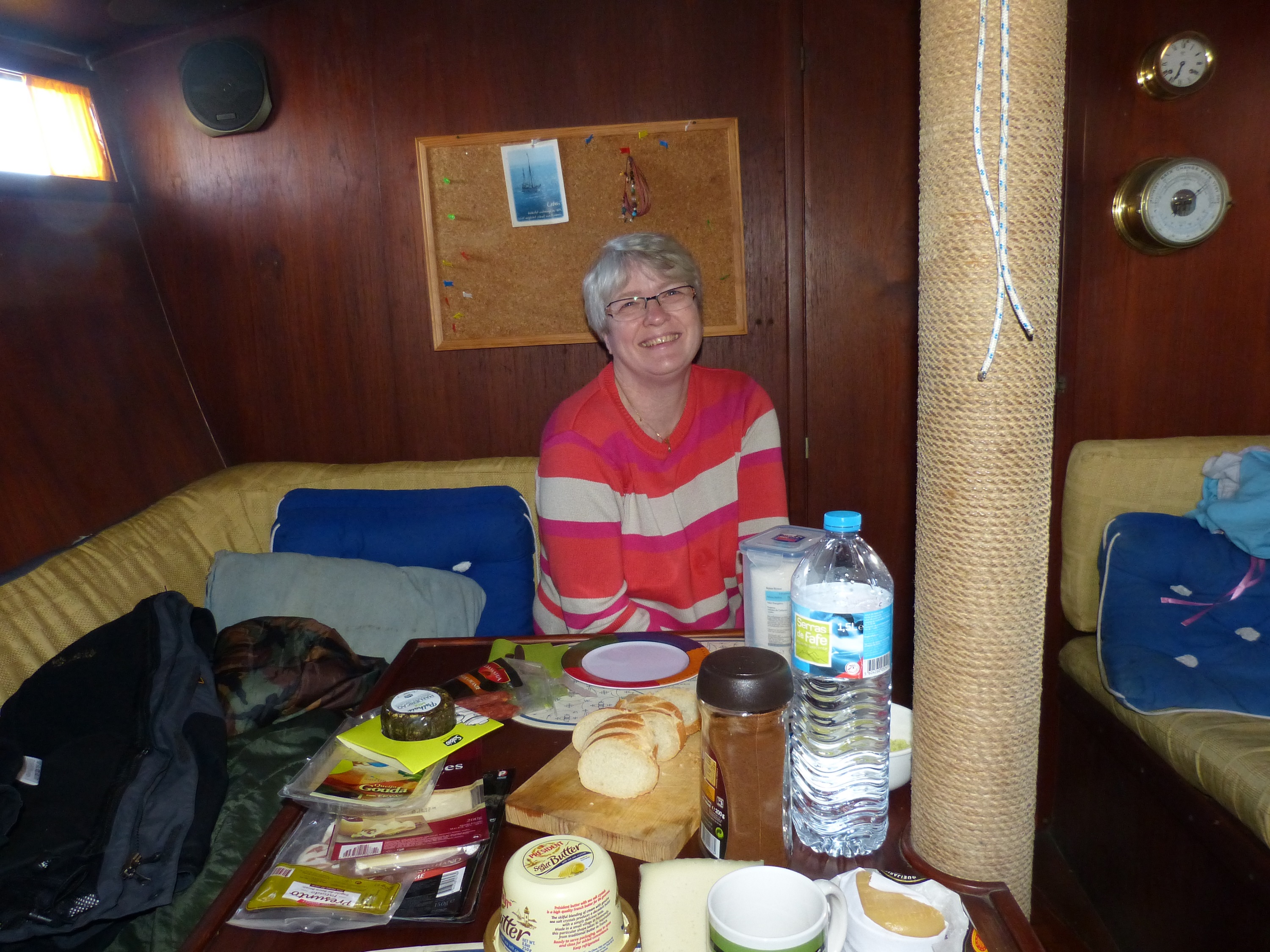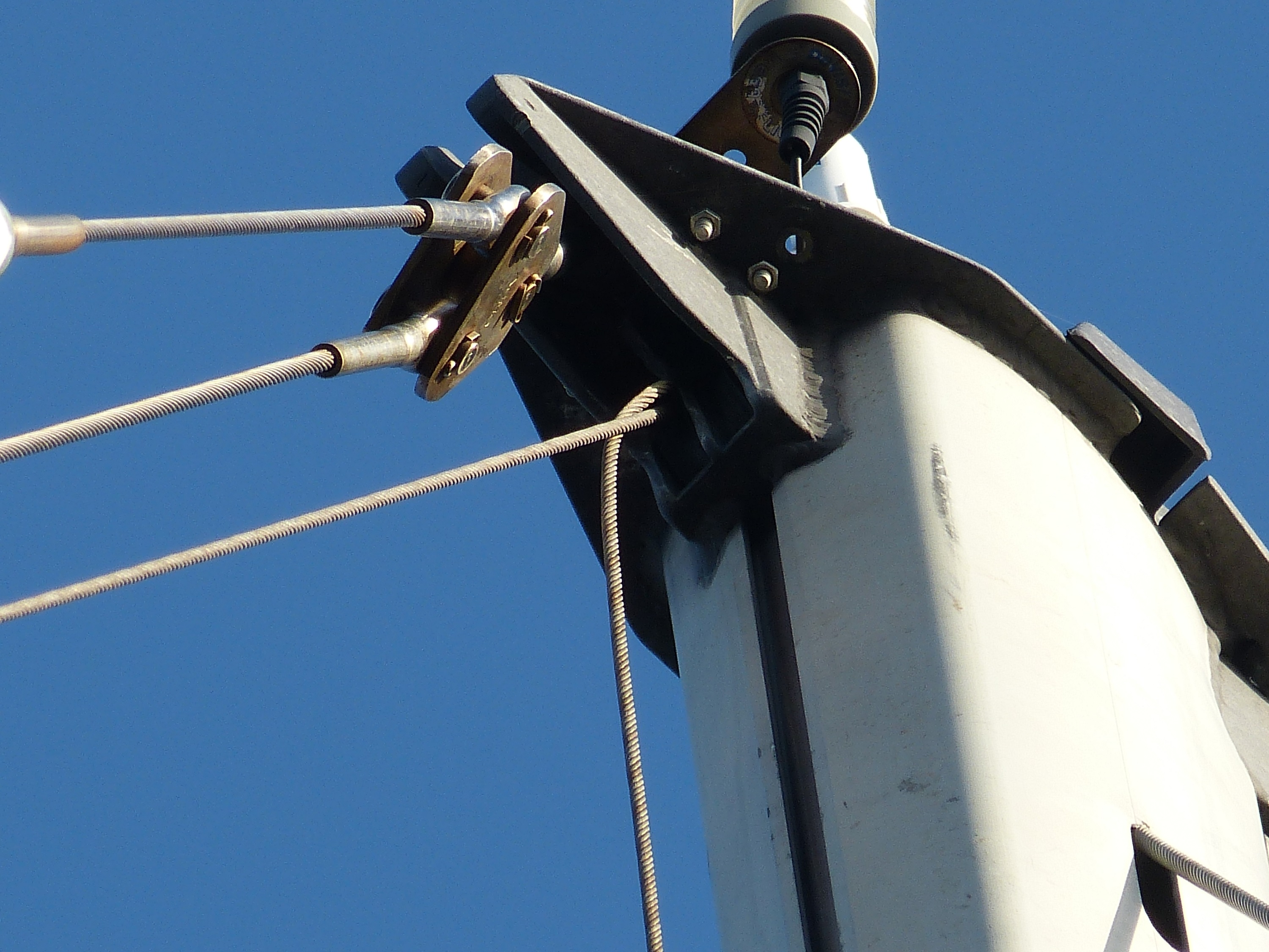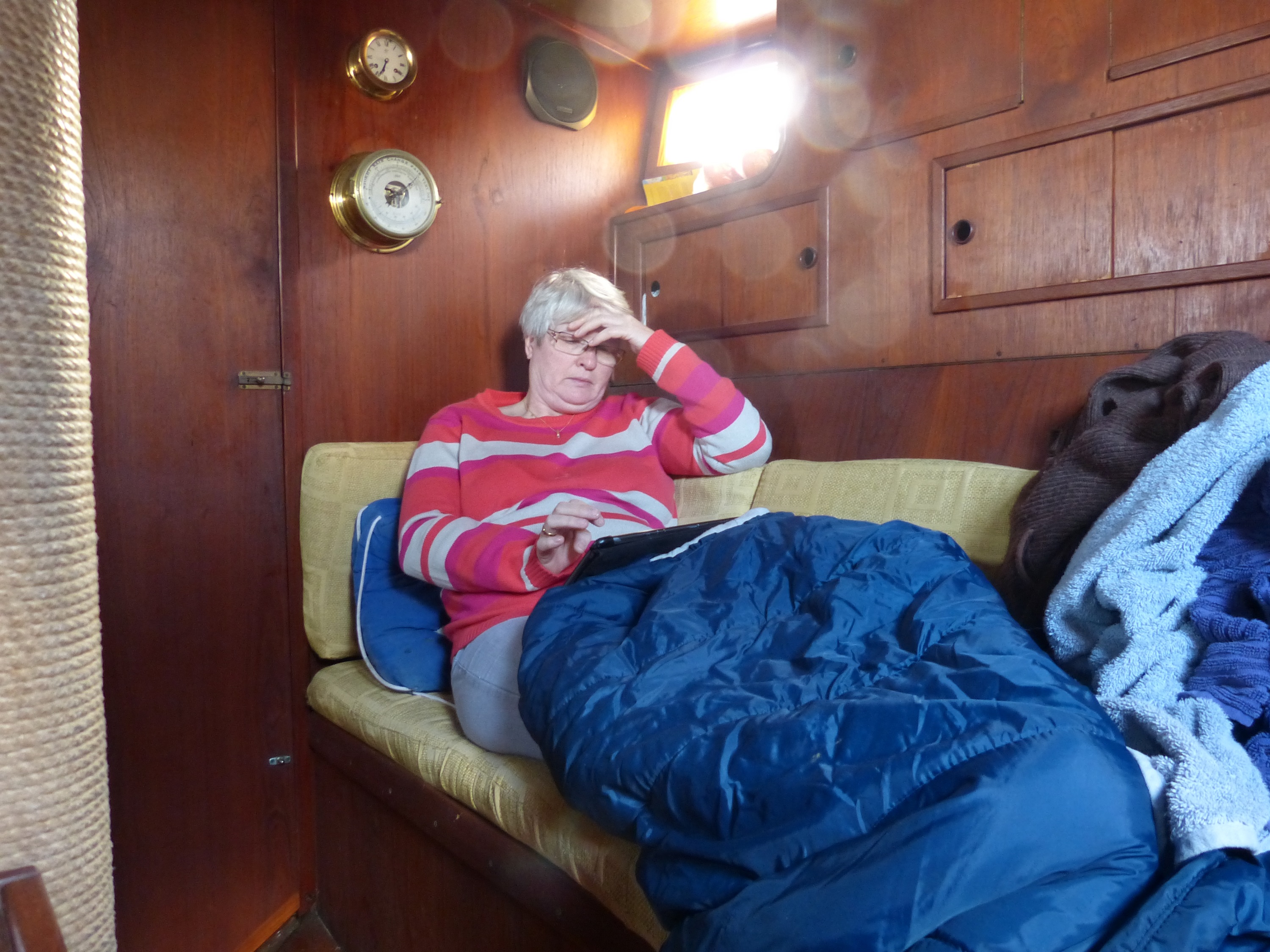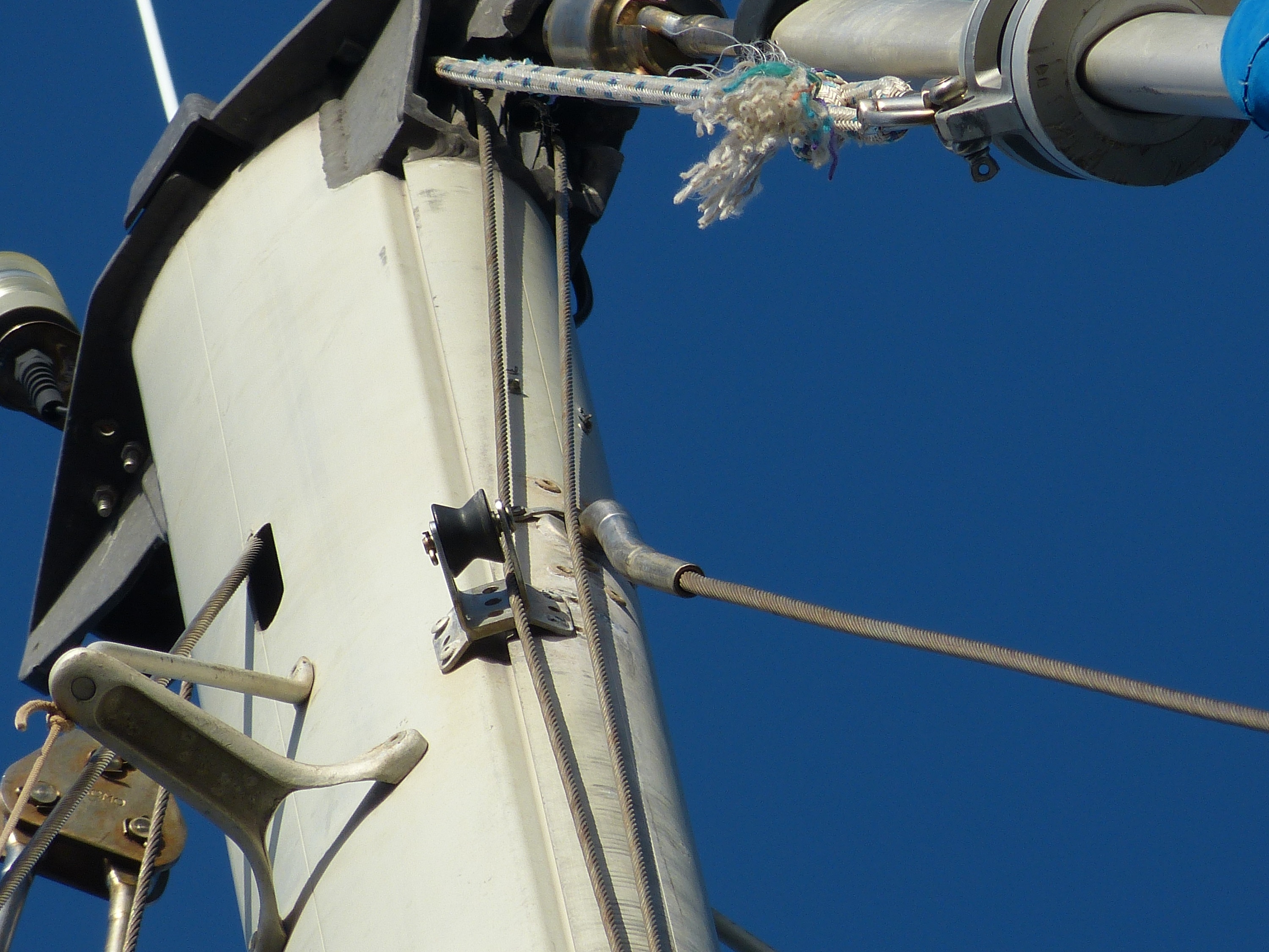 Daran sind wir gescheitert. Wir haben es nicht geschafft, die Genua einzuholen. Da die Schiene, in dem das Vorsegel geführt wird, aus nunmehr drei Teilen besteht, lässt sich die Genua nicht einfach runter nehmen. Das Abmachen des Vorstags geht auch nicht ohne weiteres, da die Verstellschrauben, die eine Verlängerung und Herausnahme der Spannung ermöglichen würden, so abgedeckt sind, dass ich nicht durch einfache Bordmittel drankomme. Insgesamt schien mir das Ganze zu aufwändig und wenig sinnvoll im Vergleich zu Plan B: Zweites (vorhandenes) Vorstag dran und mit halt etwas kleiner Fock die nächste Etappe angehen.