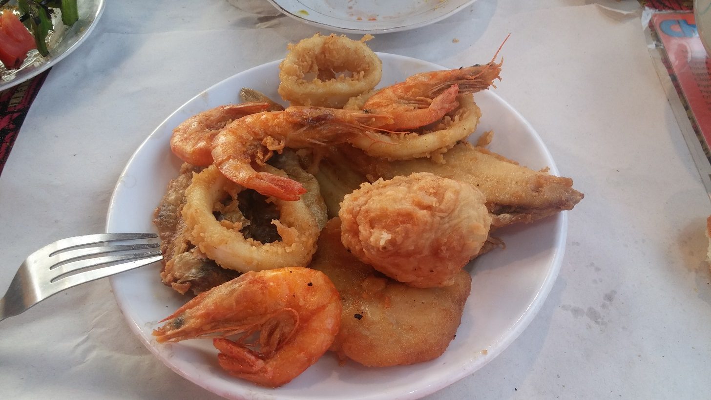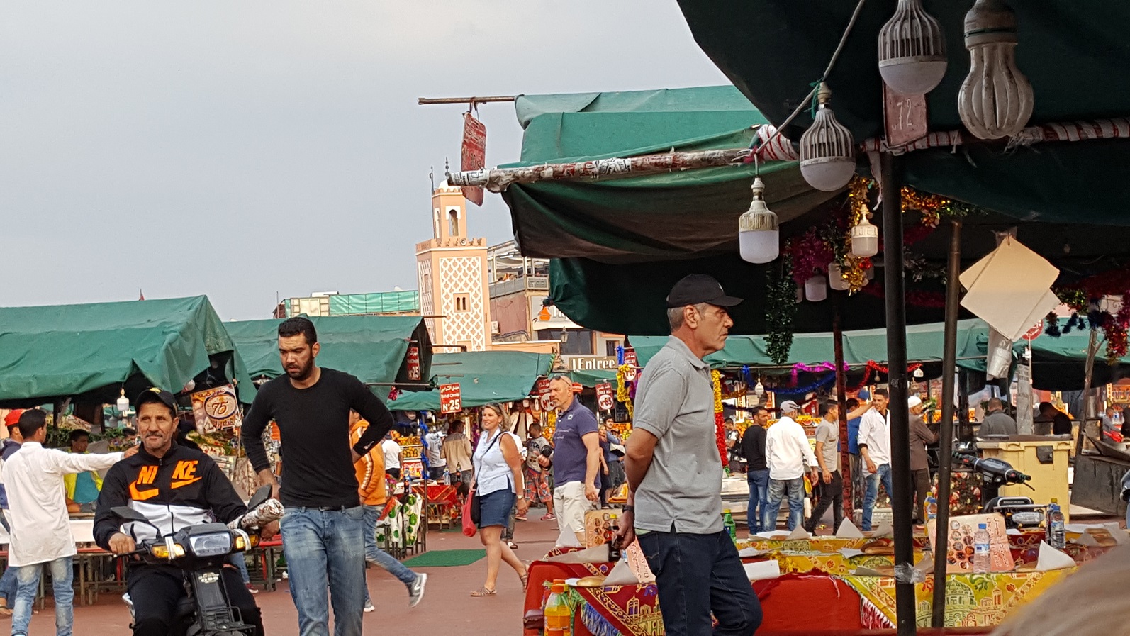 Die Marktgassen sind ein riesiges Labyrinth. Ohne google maps wären wir hilflos verloren. Aber so laufen wir quasi beliebig durch die Gassen und kommen mit maps wieder zurück zum Platz. Dort sind mittlerweile Essensstände aufgebaut, wo man alle paar Meter von eifrigen Verkäufern davon überzeugt werden soll, dass bei Ihnen das Essen am besten und billigsten ist.