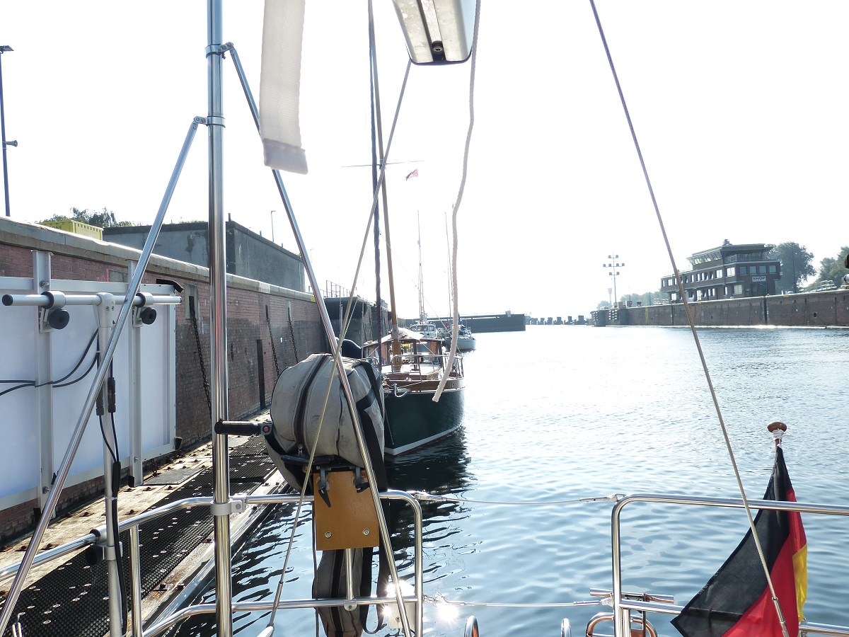 Etwas spektakulärer war die Schleuse am anderen Ende in Brunsbüttel. Die hatte schon einiges mehr an Höhe auszugleichen. Außerdem lag in der engen Schleusenkammer noch ein dicker Pott neben uns. Aber auch hier alles gut gegangen.