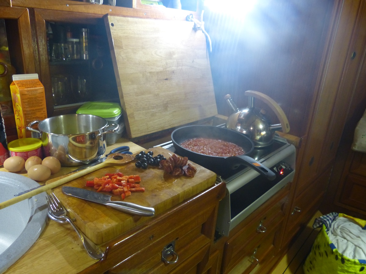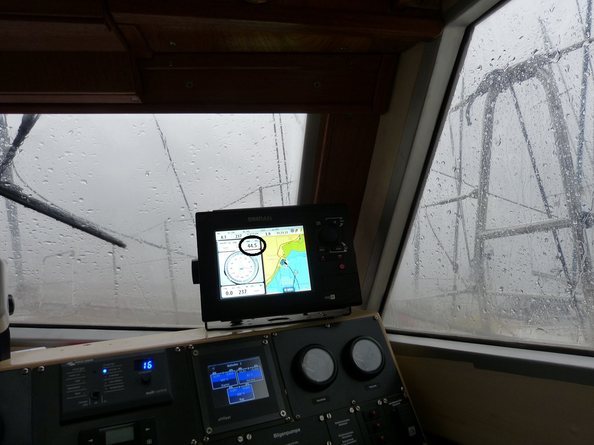 Tja, und der Wetterbericht stimmt leider. Mittlerweile ist es Mittwoch, wir verschanzen uns im Boot, die Heizung läuft und draußen reichlich Regen bei Windböen über 40 kn. Bis zu > 50 kn sind vorhergesagt. Da der Magen knurrt, werde ich wohl oder übel im Schlechtwetteranzug zum Bäcker laufen um ein frisches „Barra de pan“ fürs Frühstück zu besorgen. Ist schließlich schon kurz nach 12 Uhr.