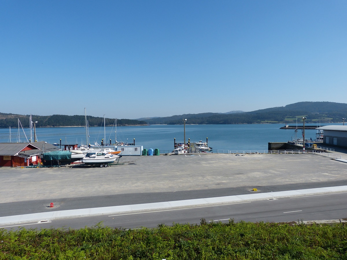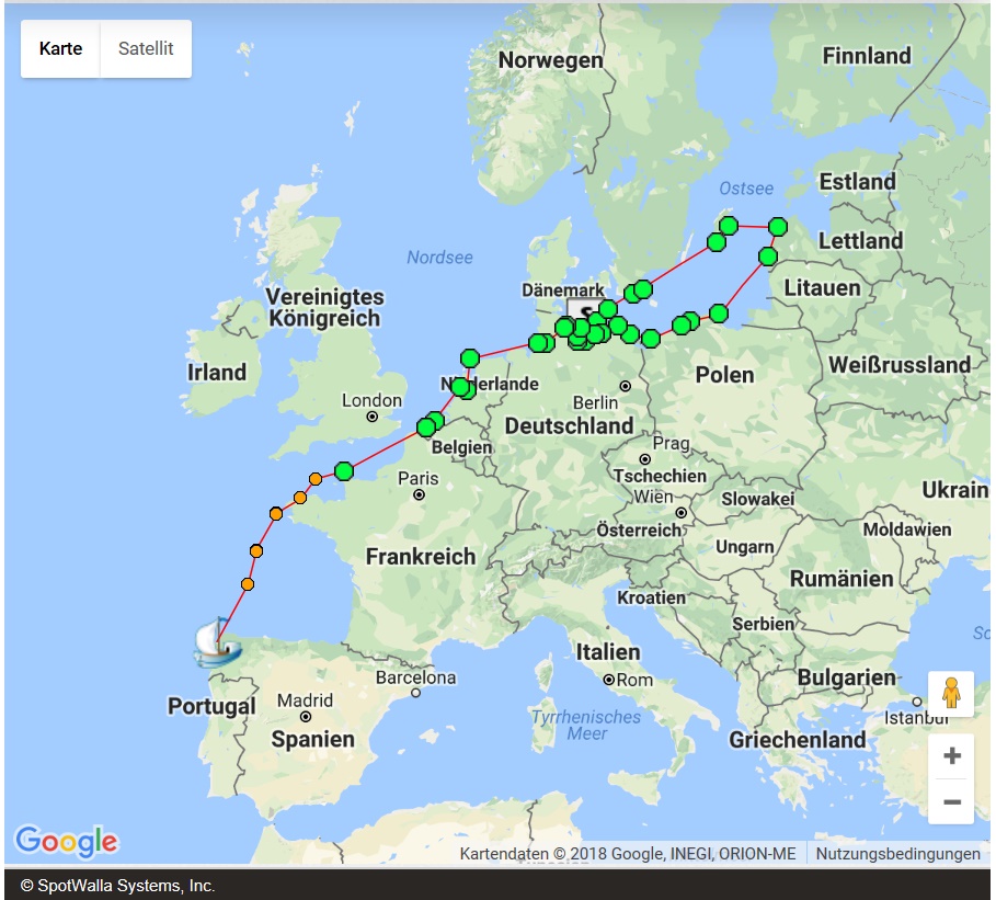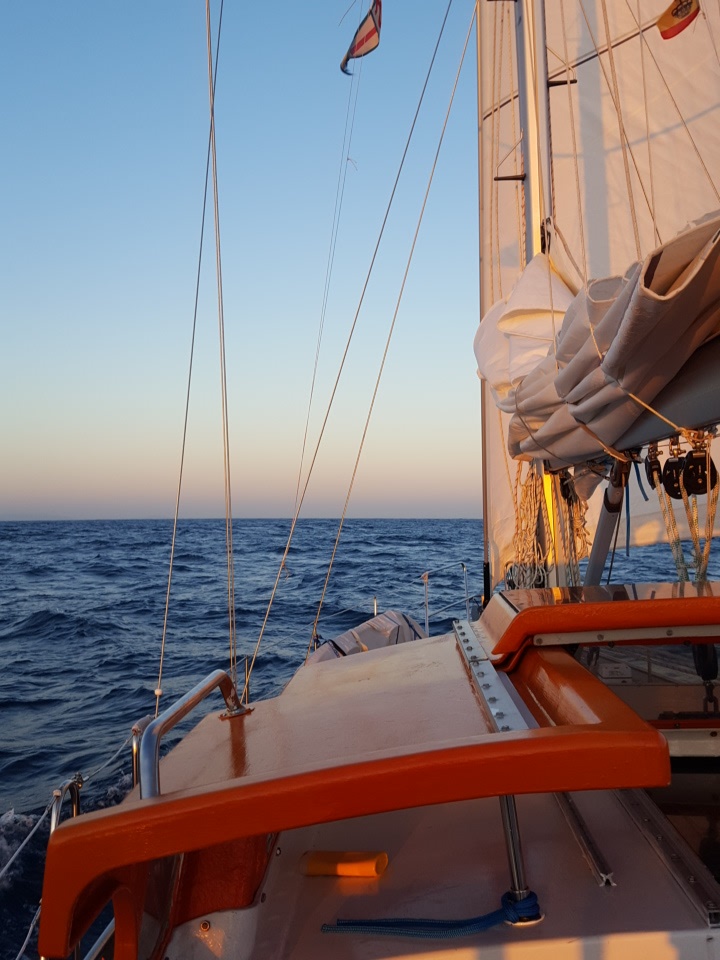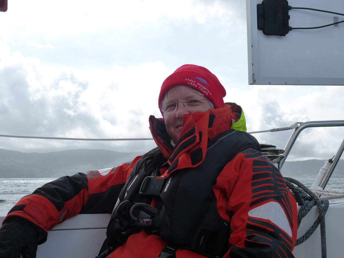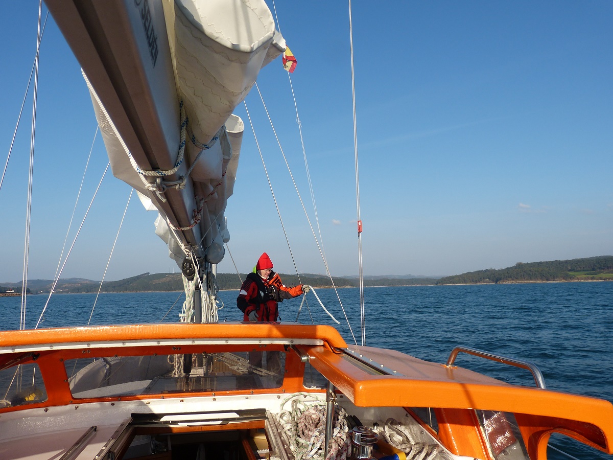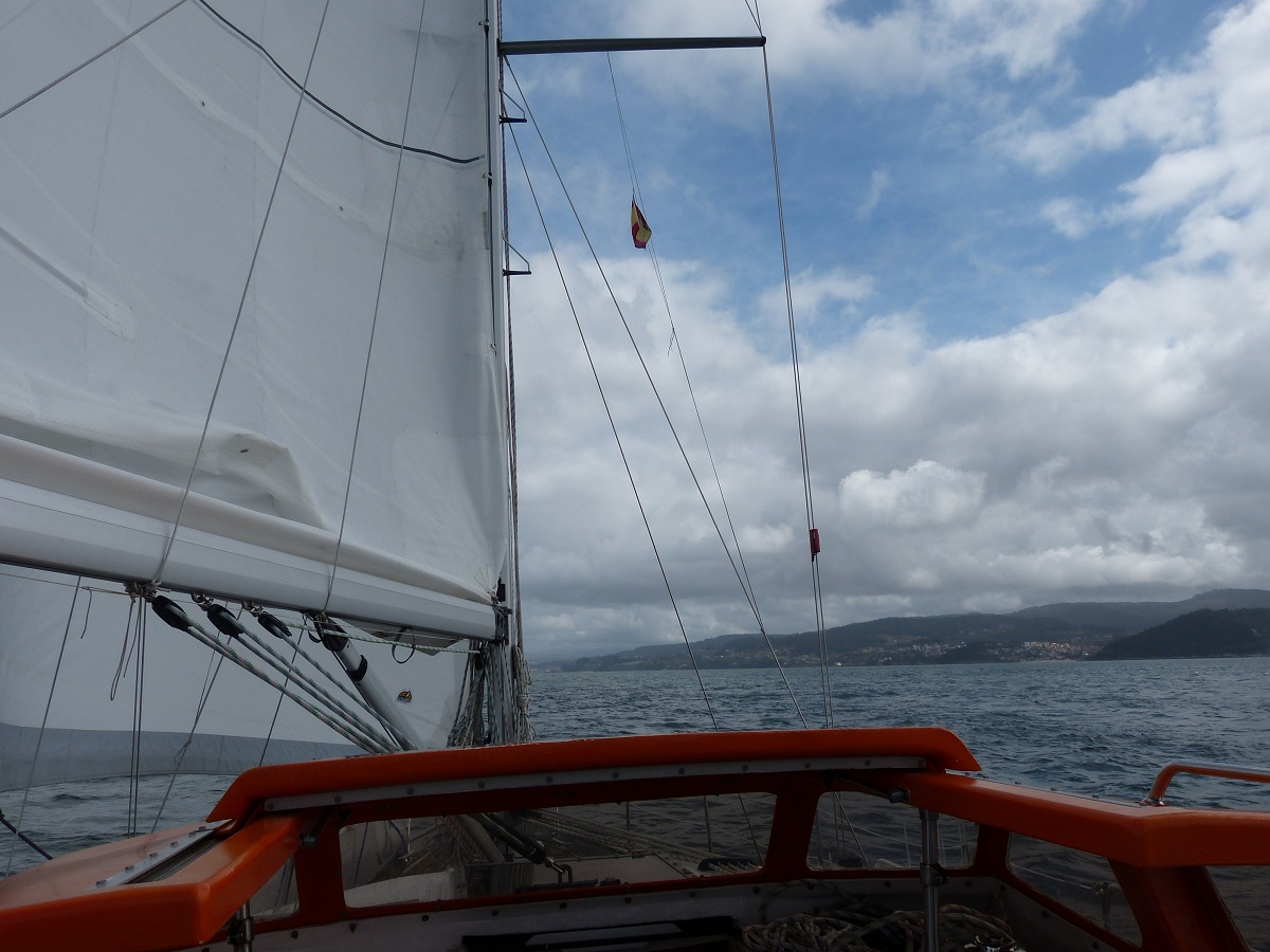 Das erste Drittel der Strecke noch unter Motor, dann Segel setzen. Bei dem Bogen, den wir in die Ria hinein segeln, haben wir Anfangs Wind von schräg vorne, dann seitlich und zum Ziel hin von ziemlich hinten. Alles Bestens. Zwischendurch kommt sogar immer mal wieder die Sonne zum Vorschein. Segeln vom Feinsten. So könnte ich tagelang dahingleiten.