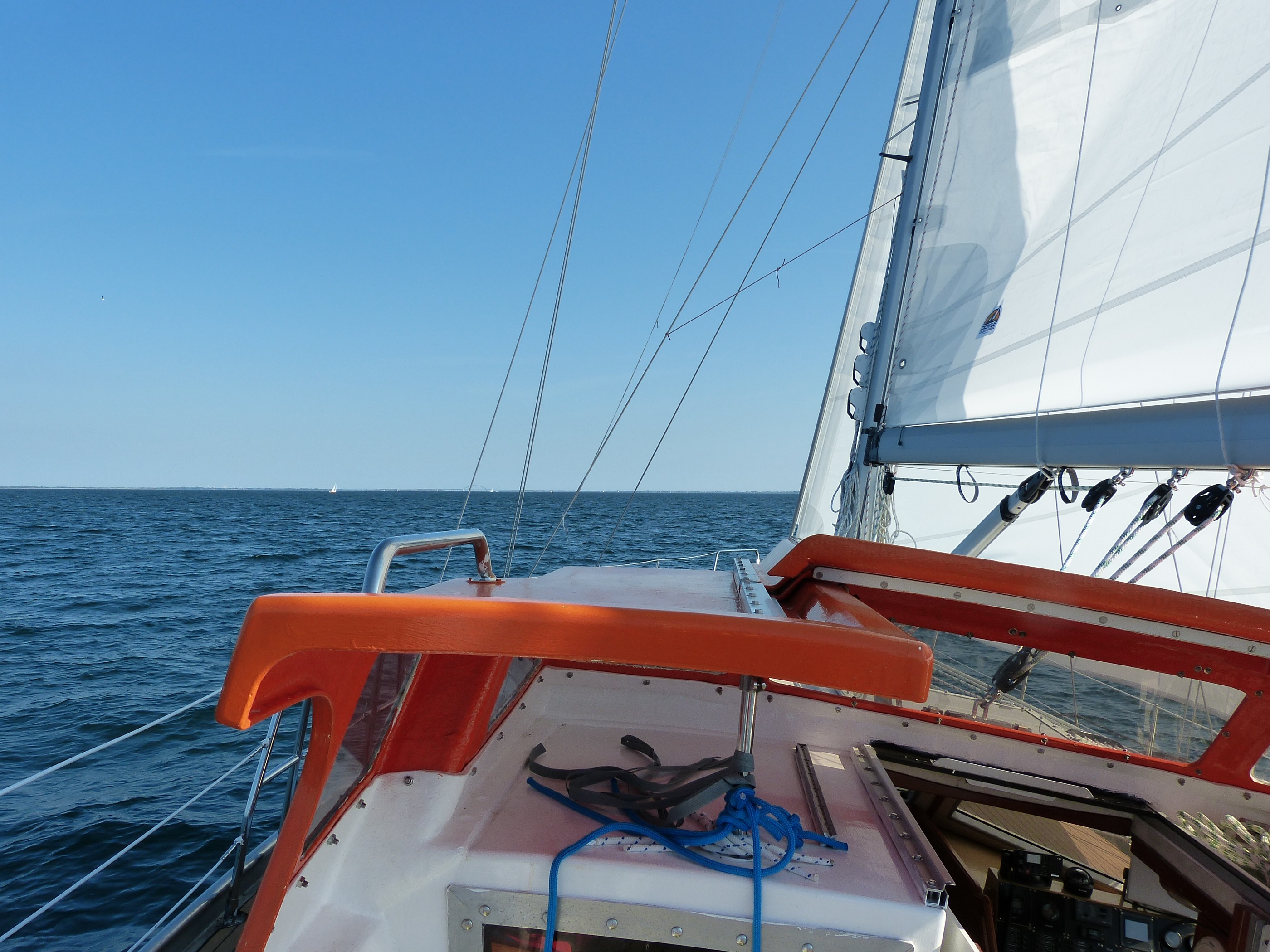 Innensteuerstand: Da absolute Flaute herrschte, waren wir unter Motor unterwegs. Es war sonnig, aber kühl. So habe wir das Boot das erste Mal vom Innensteuerstand aus bedient. Schon toll, durch die reichlich Fenster ist das bei Sonnenschein eine Art Wintergarten.