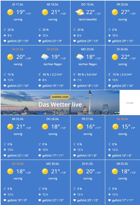 Das Wetter ist mittlerweile auch auf unserer Seite. Neid auf Deutschland ist nicht länger erforderlich, auch Portugal nähert sich jetzt der 20 Grad-Grenze. Auch die Vorschau ist vielversprechend: