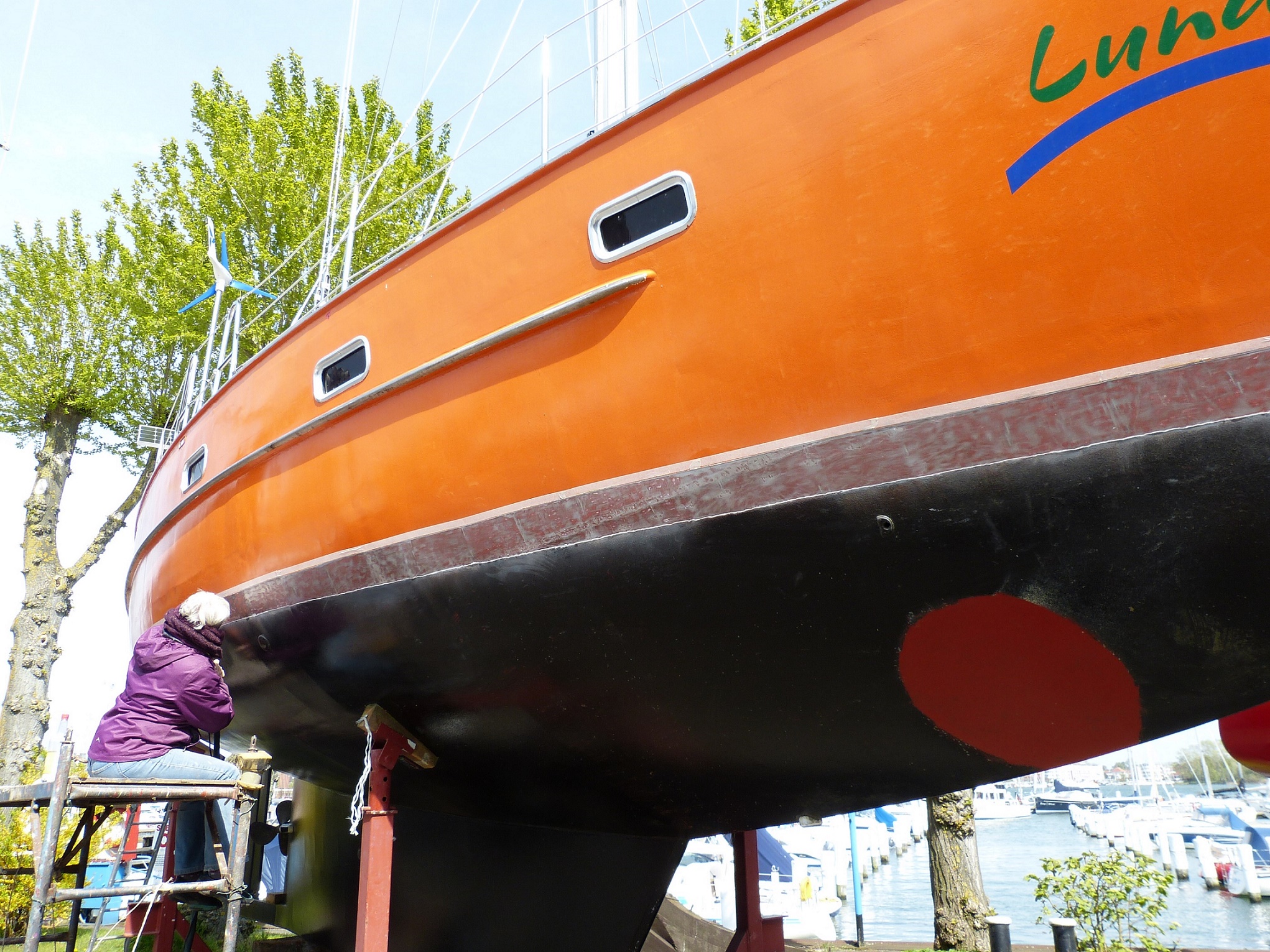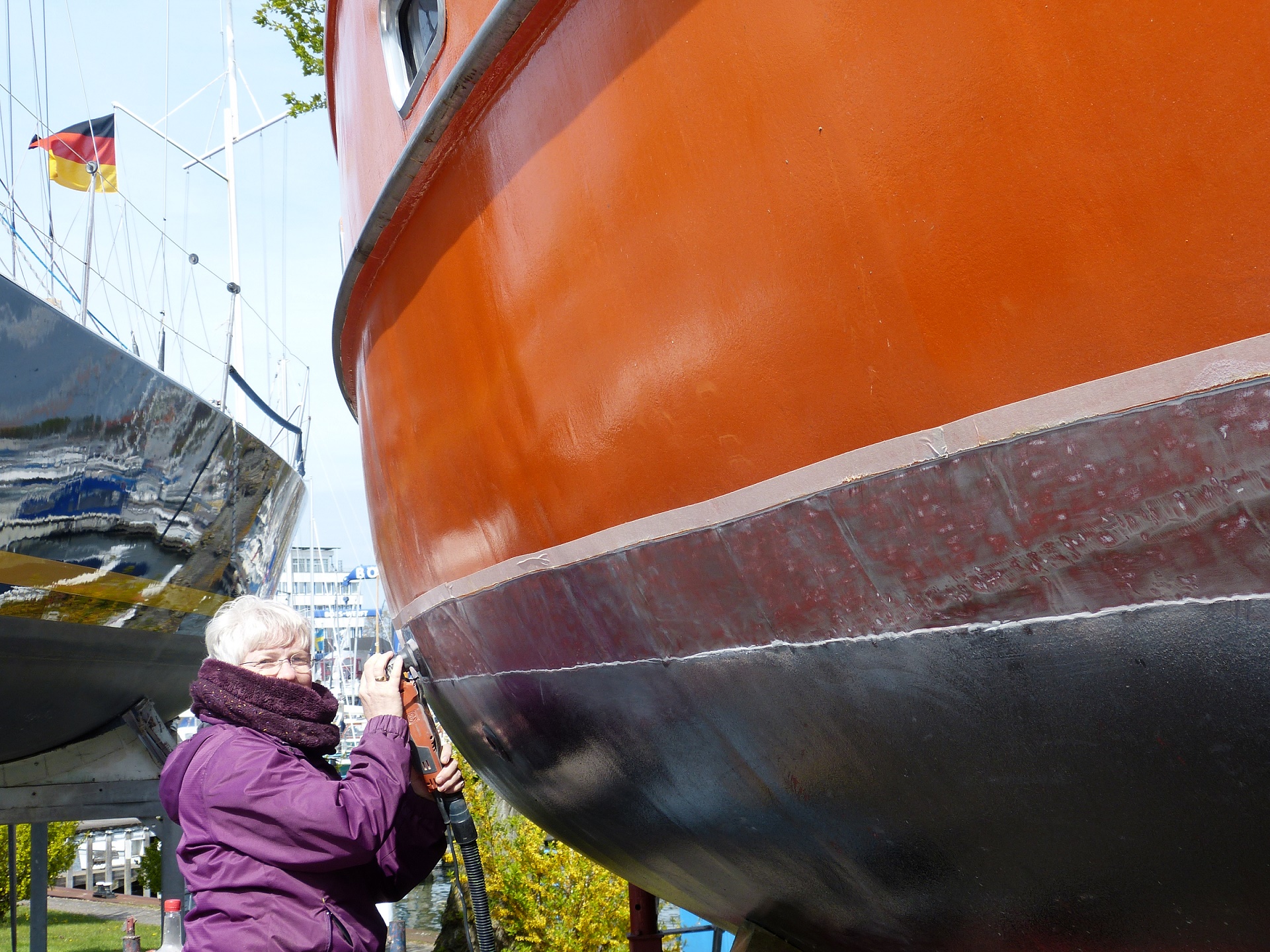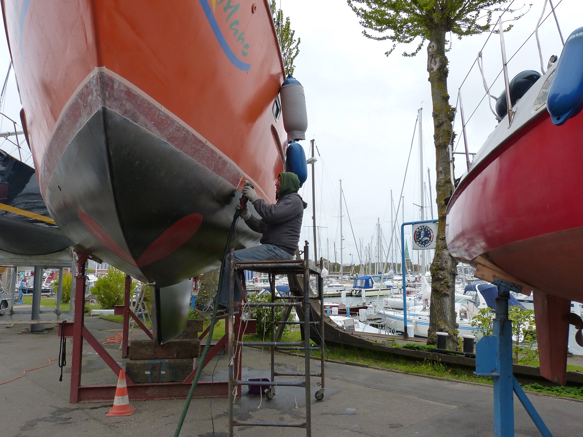 Krantermin haben wir schon mal um 5 Tage verschoben. Nach dem Schleifen müssen wir ja noch 7 Lagen Farbe (Primer, Antifouling) aufbringen und abschließend wollen wir dem gesamten Unterwasserbereich noch eine Lage Antifouling gönnen.