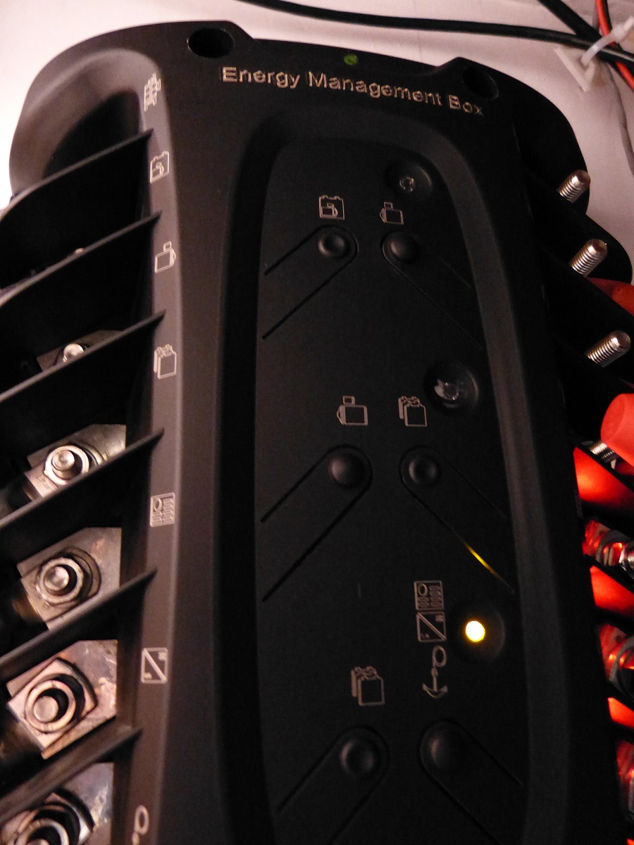 Als der Wind dann schon wieder eine Pause einlegt, Motor an. Beim Gang ins Boot wieder dieser Geruch. Nase hierhin und dorthin gesteckt, der Geruch kommt wieder aus Richtung Batterie-/Elektroschrank. Geöffnet und leichte Panik. Die EM-Box raucht! Schnell Motor aus, Verbraucher abgeschaltet und schon mal nachgedacht wo der Feuerlöscher ist. Aber der Rauch stellt sich direkt ein. (EM-Box: Energiemanagement, diese Box verbindet Ladegeräte und Batterien und bietet Informationen über den Zustand der Batterien und woher der Strom kommt bzw. wo er verbraucht wird). Mehr Info hier. Hört sich theoretisch doch toll an.