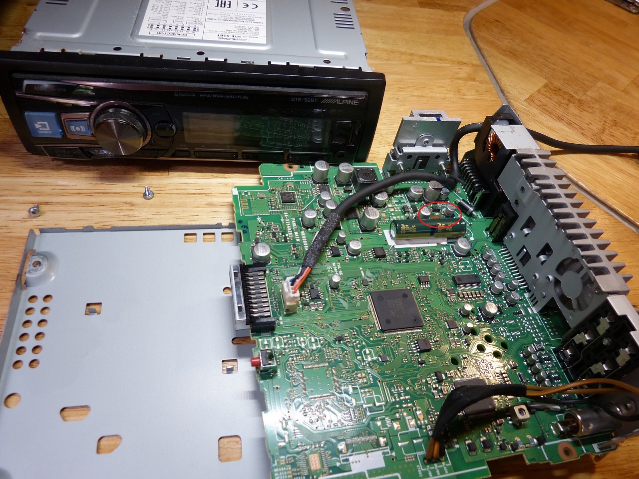 Das Zerlegen desselben zeigt, dass auf der Platine ein kleiner Bereich „verschmort“ ist. Vermutlich Feuchtigkeit reingekommen. Muss also ersetzt werden, damit wir weiterhin Musik für unsere lauen Sommerabende haben.