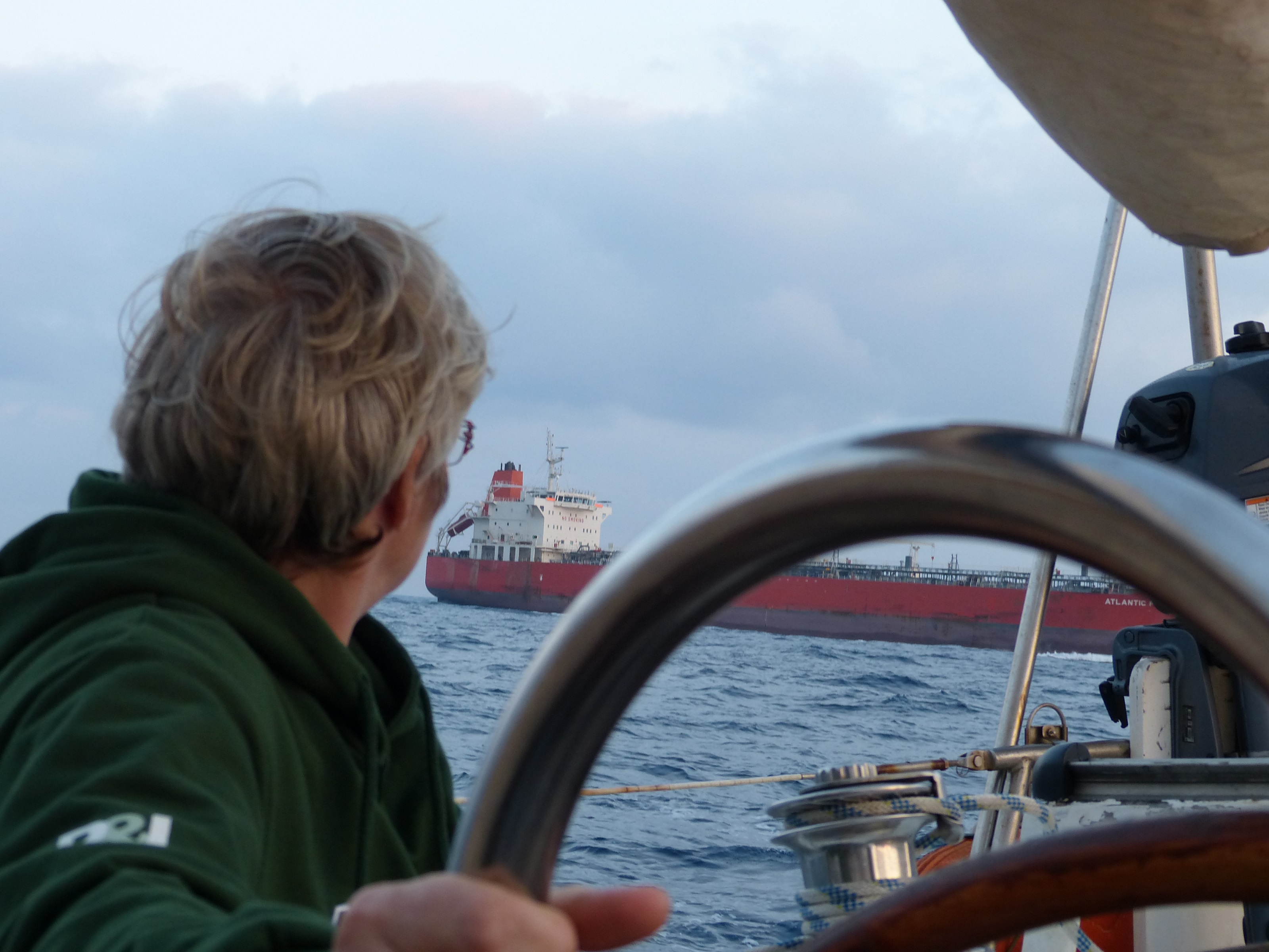 Es waren wundervolle sternenklare Nächte, nur ab und zu ein Tanker bzw. Containerschiff überwiegend mit reichlich (2 sm) Abstand. Nur einer meinte er müsste das Spiel “wer weicht zuerst aus” spielen. Da wir bei dem Spiel ohnehin ohne Chance sind, habe ich Kurs gehalten und als ich über Funk versucht hatte, das nähernde Objekt zu erreichen, dann doch ein Ausweichmanöver dessen. Sah schon eher bedrohlich aus, war aber an sich keine Gefahr.