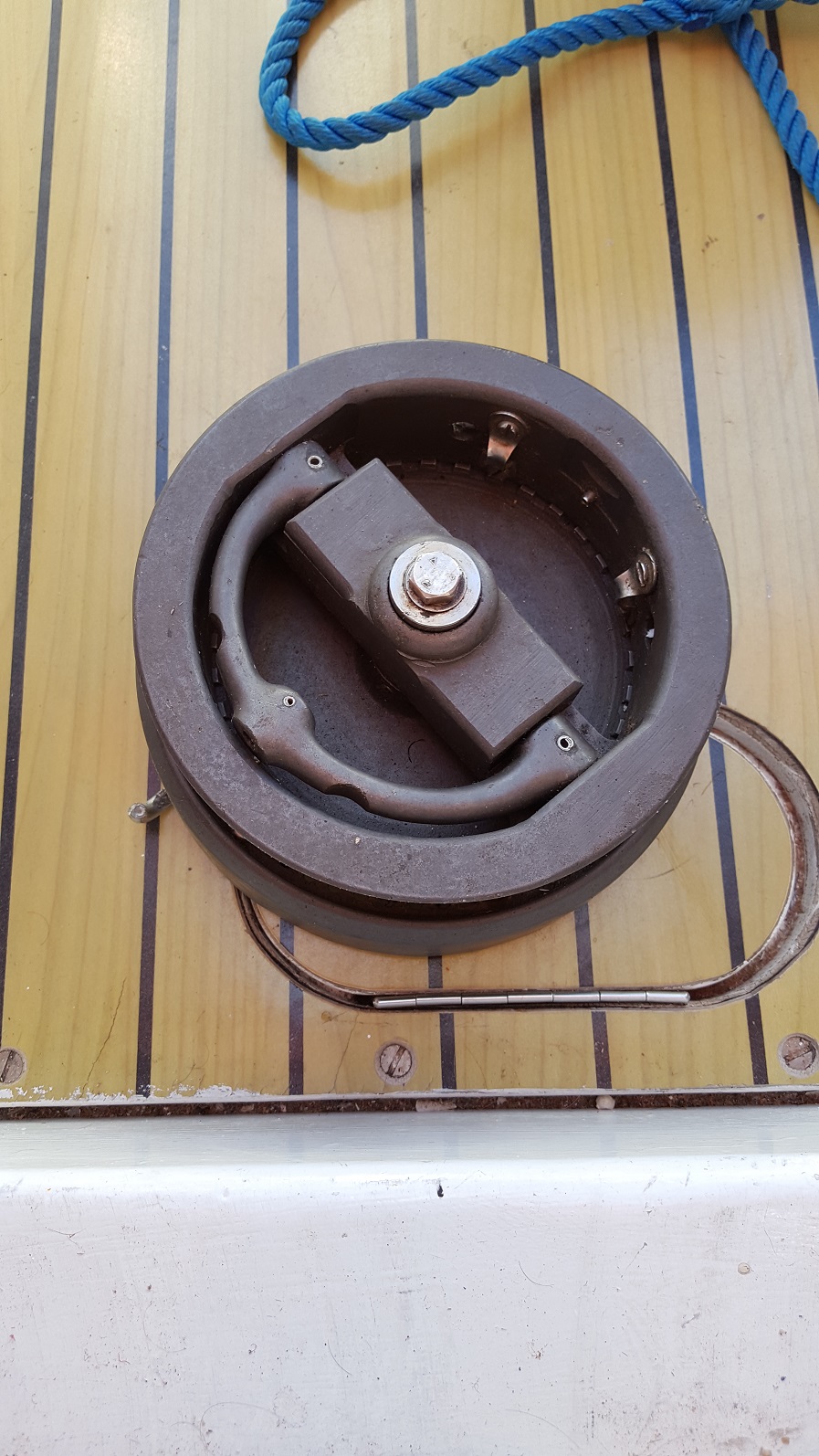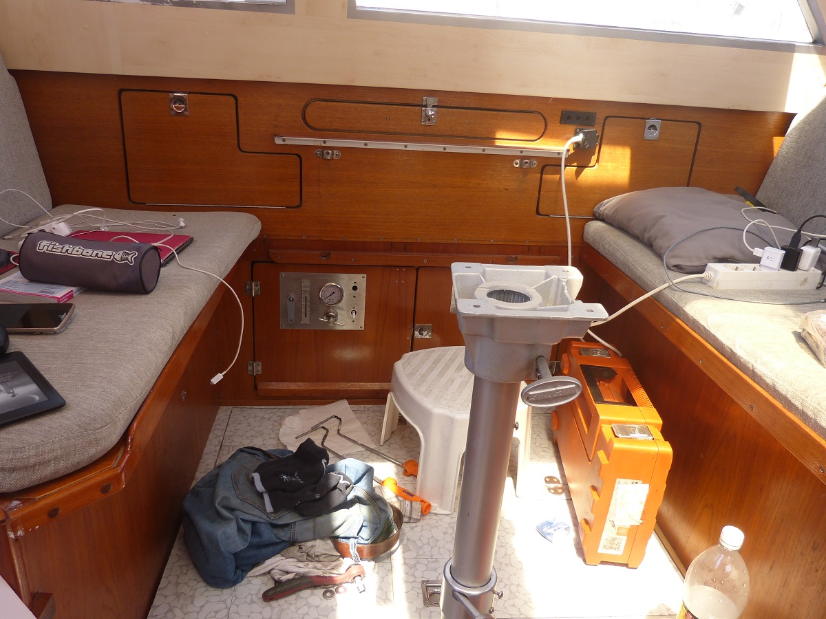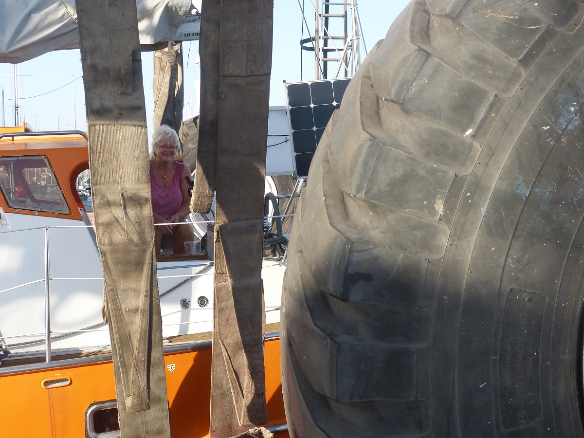 Nicht erledigen konnten wir als wichtigsten Punkt Emma, die Aries-Windsteuerung, ans „Laufen“ zu bekommen. Mit der Pinne klappt es wohl definitiv nicht. Jetzt wollen wir es noch über das Ruder im Cockpit versuchen. Die dafür erforderliche Trommel haben wir, einige Befestigungteile dazu fehlen, aber Lean, der „Aries-Mann“ aus Amsterdam, müsste diese mittlerweile auf den Weg geschickt haben.