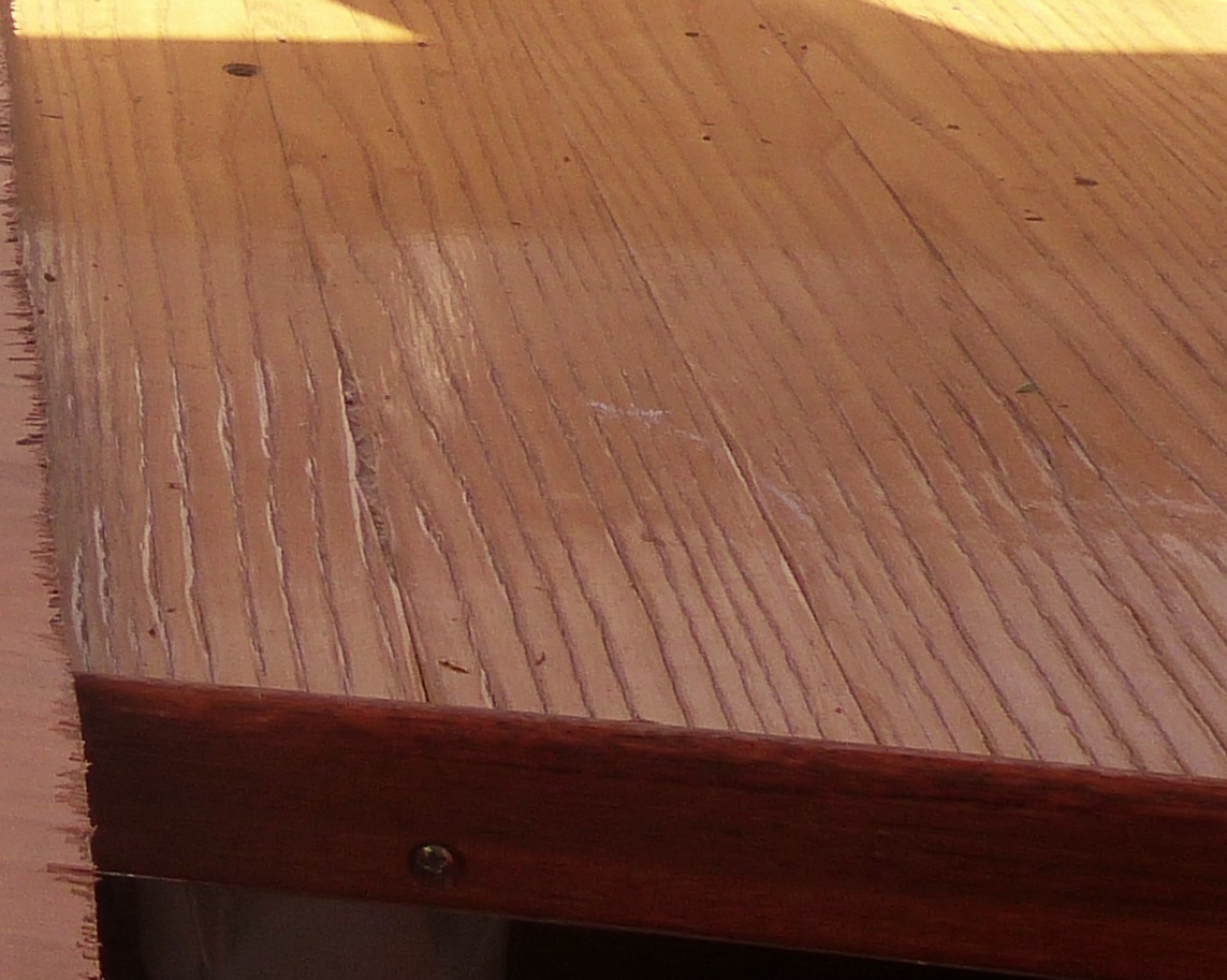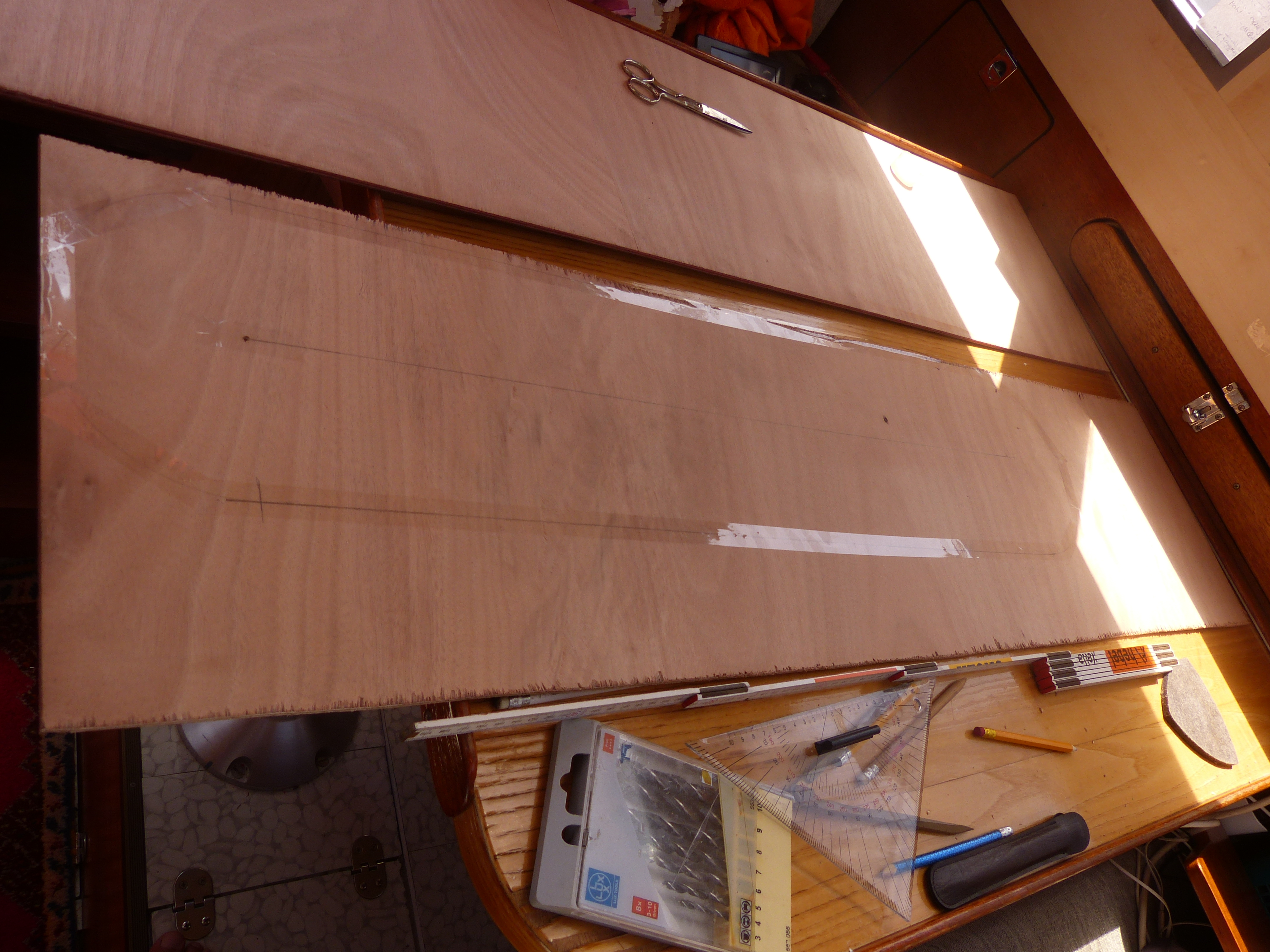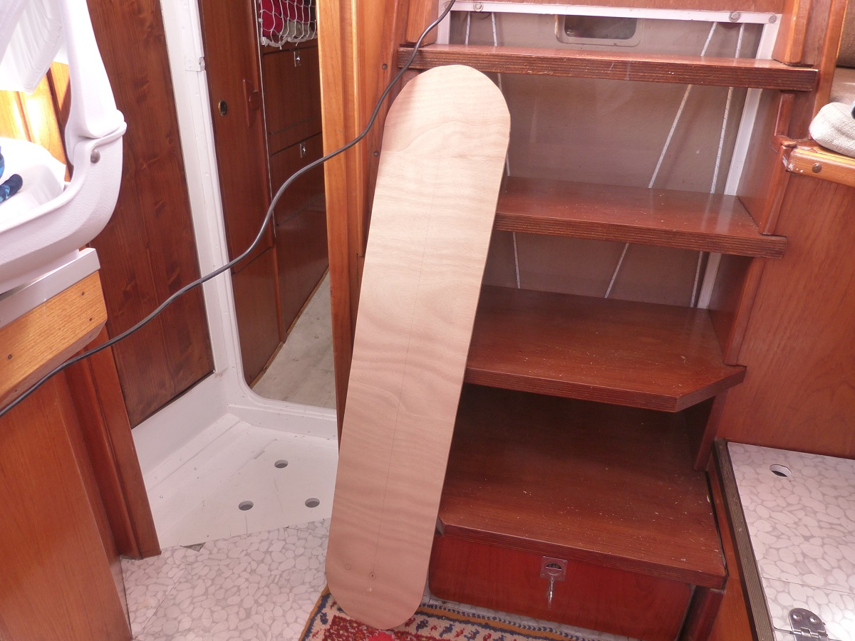 Jetzt fehlt noch der Tisch im Innensteuerstand. Der hiesige Schreiner bezieht den mit einem neuen Laminat, da das alte aufgesplittert ist.