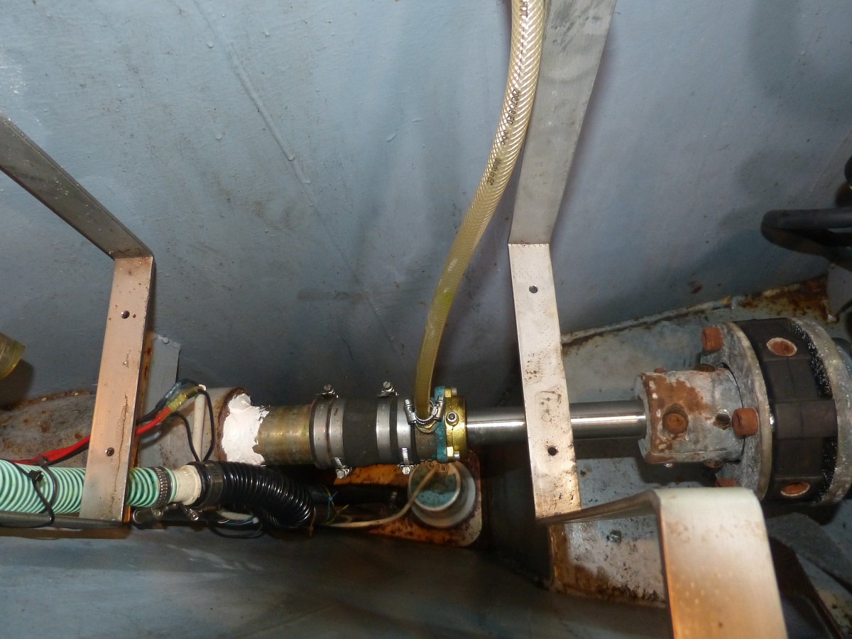 Neben dem Unterwasseranstrich war die Leckage in der Wellenanlage zu ergründen. Hinterm Propeller hatte sich eine Sika-Flex-Abdichtung gelöst und ein kleines Leck entstehen lassen (auf dem Bild hatte ich diese dann bereits komplett entfernt). War das die Ursache und die Wellendichtung ist noch ok und könnte noch länger genutzt werden?