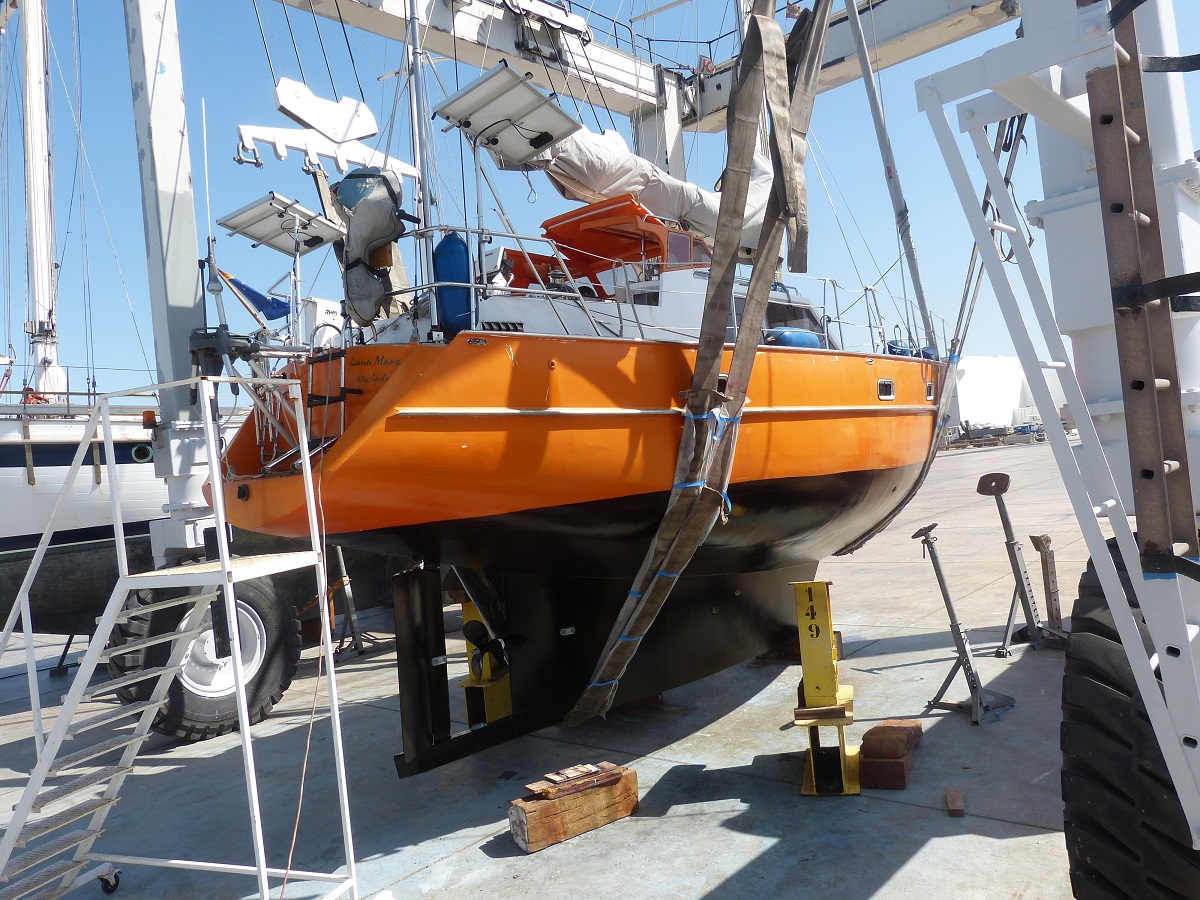 Nachdem Luna Mare seit Montag dieser Woche an Land stand, sind wir seit heute morgen zurück im Wasser. Der Unterwasseranstrich war notwendig und die Arbeiten haben gut geklappt. Toller Service der Marine hier: Gestern Abend wurde die Luna Mare bereits in den Kran genommen, so dass wir die durch die Stützen verdeckten Stellen noch streichen und diese dann über Nacht trocknen konnten.
