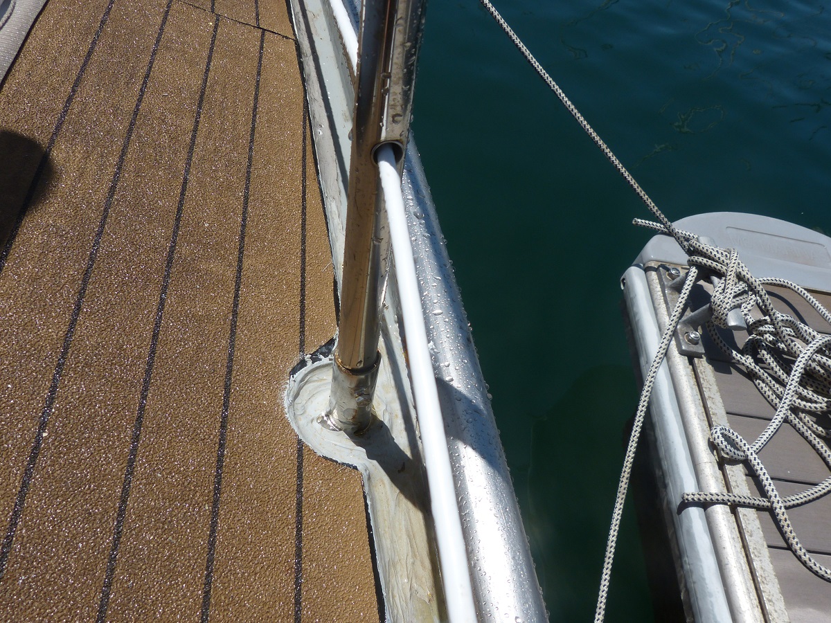 Nachdem wir auch die Relingstützen „großzügig“ abgedichtet haben, sollte Wasser nur noch in homöopathischen Mengen ins Boot gelangen können. Schaun mer mal.