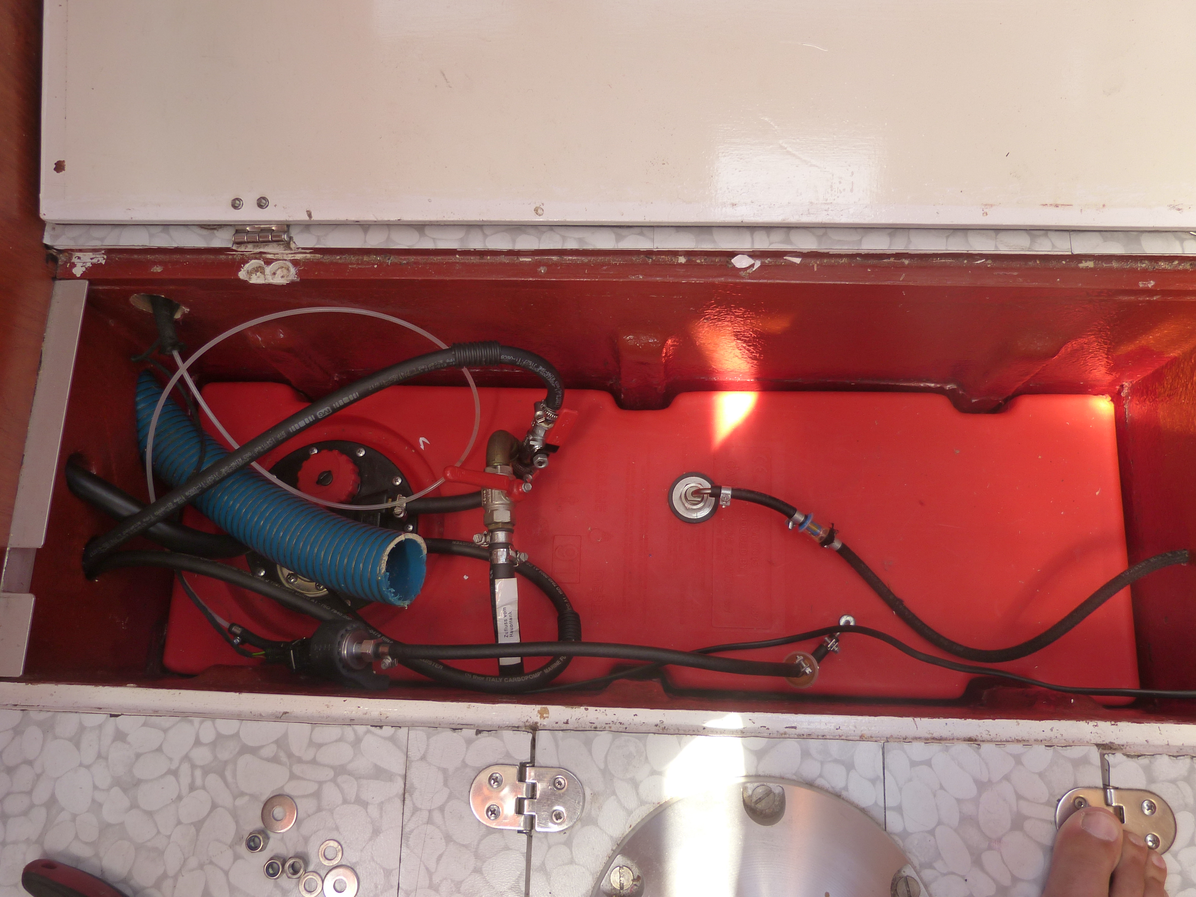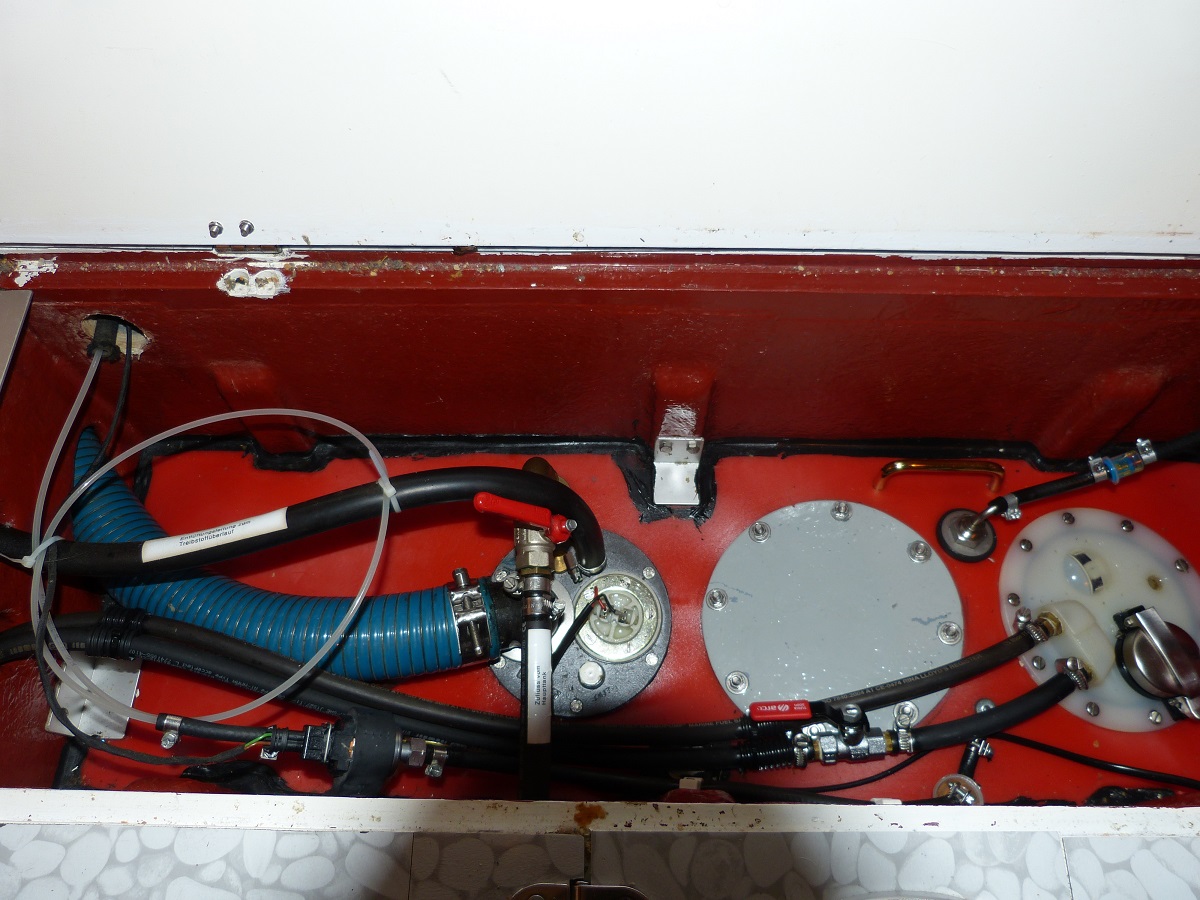 Der neue Tagestank ist ebenfalls installiert. Jetzt muss nur noch Jimmy vom Marina-Nautic-Shop den Anschlussstutzen beibringen, damit wir den Tankschlauch anschließen können. Zur Not ginge es aber auch ohne. Dann müssten wir halt mit dem Tankstutzen ins Boot direkt an den Tagestank. Nicht optimal, aber machbar.